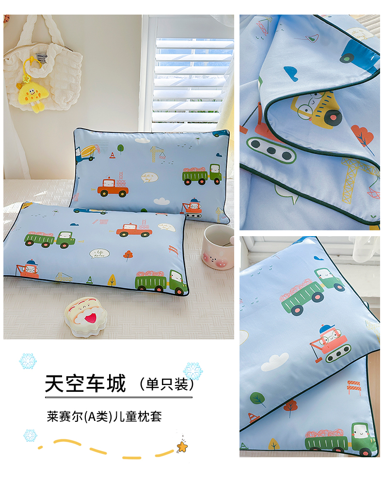 商品名称:姝辰 2026新款莱赛尔嵌绳卡通印花枕套儿童夏季凉感冰丝枕套幼儿园乳胶枕套枕罩 天空车城