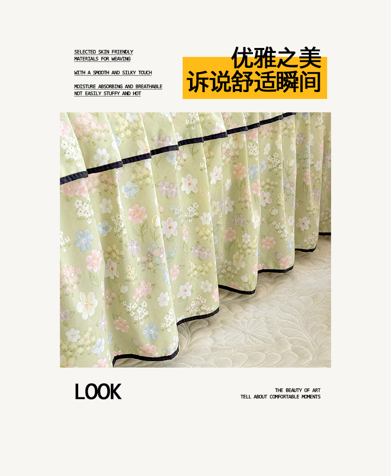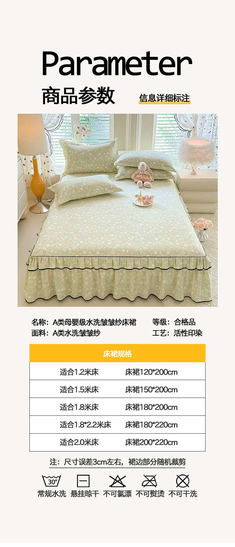商品名称:(总)优家居 2026新款A类水洗棉床裙单件三件套皱皱纱韩版公主风花边床罩直播爆款外贸定制