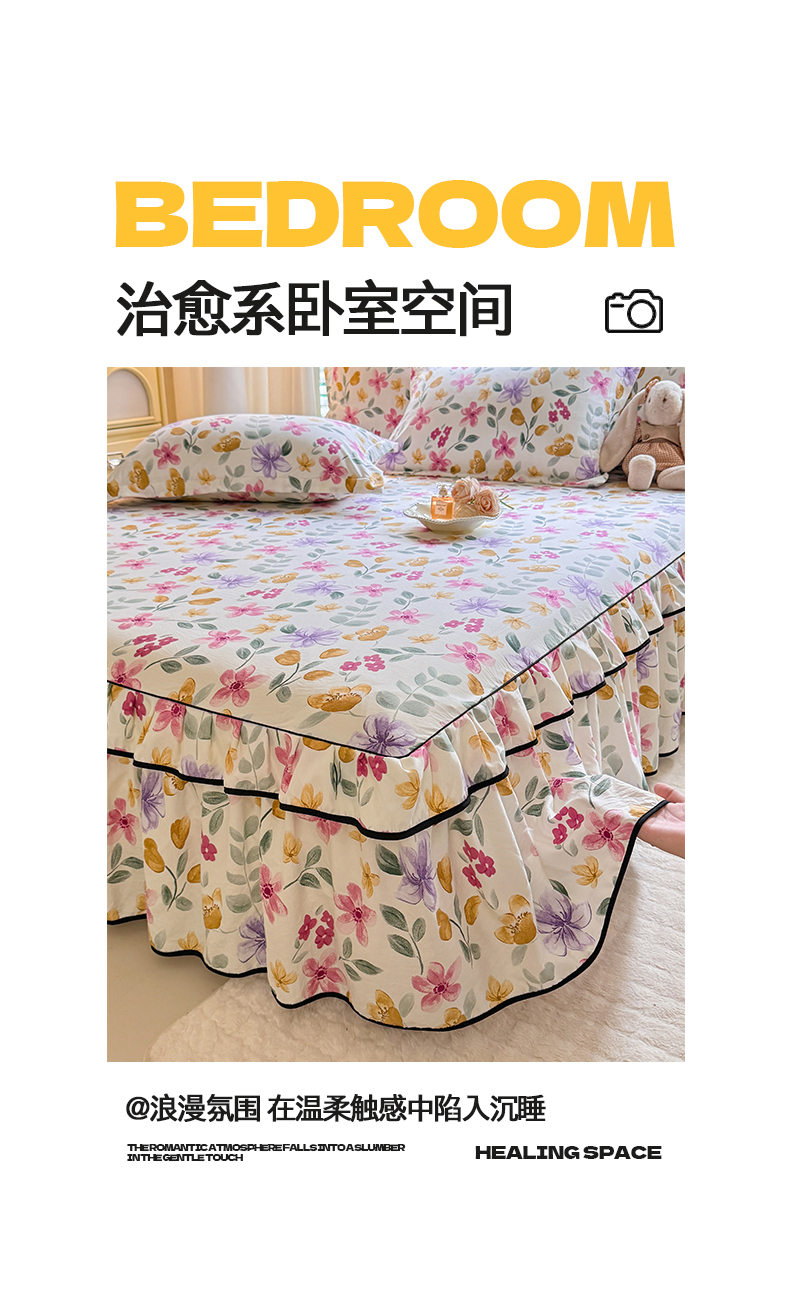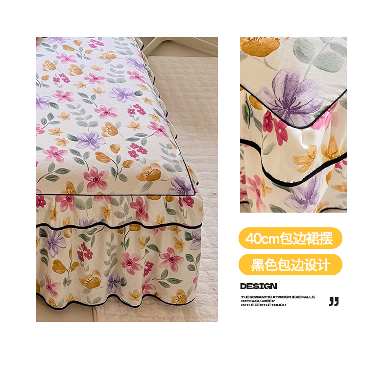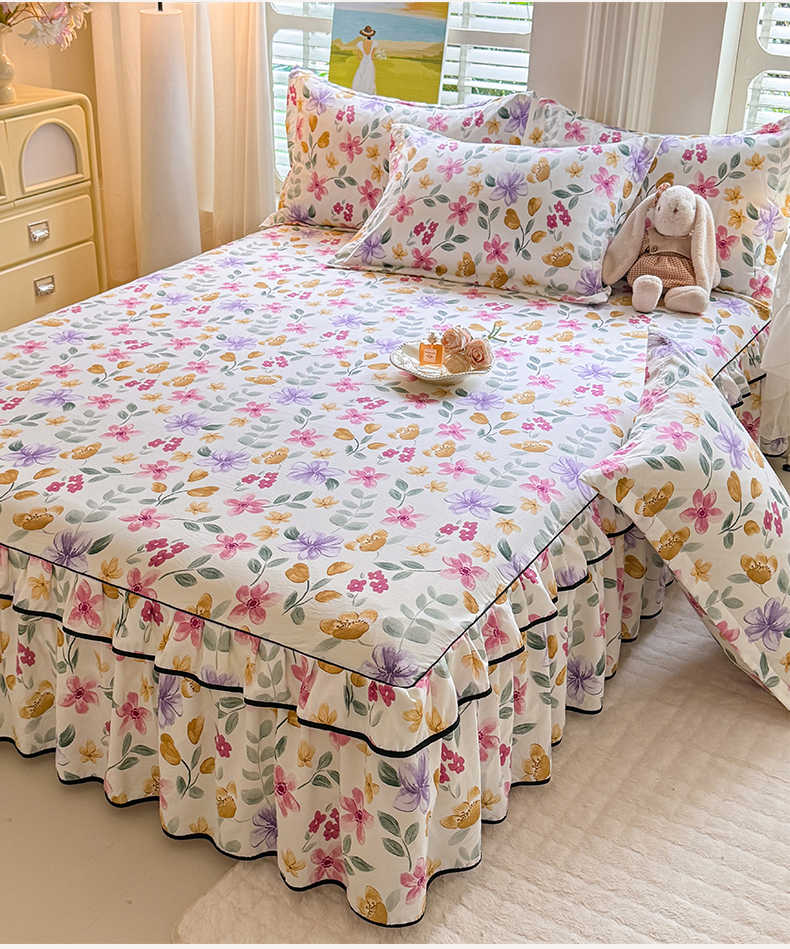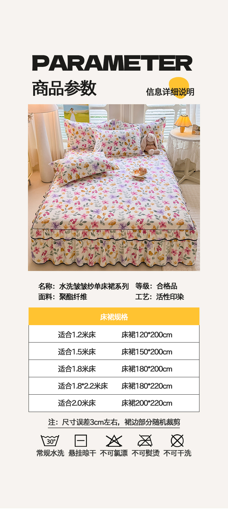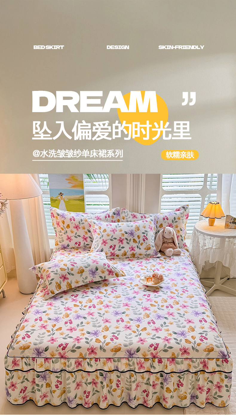 • 91家纺网 家纺一手货源 找家纺 优家居 2026新款A类水洗棉床裙单件三件套皱皱纱韩版公主风花边床罩直播爆款外贸定制 繁花似锦