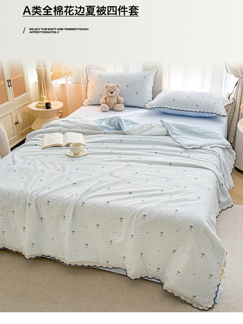 (总)招财星家纺 2026新款A类全棉花边云感双层纱大豆纤维夏被四件套夏被夏凉被空调被(带质检报告买家秀),花边款-金枝玉叶,花边款-缤纷花朵,花边款-草莓气球,花边款-格子木马-蓝,花边款-格子木马-绿,花边款-花季,花边款-花语,花边款-花园秘密,花边款-可爱熊猫,花边款-喇叭花,花边款-绿曼,花边款-萌宠花园,花边款-幸运结-蓝,花边款-幸运结-绿,花边款-长颈鹿