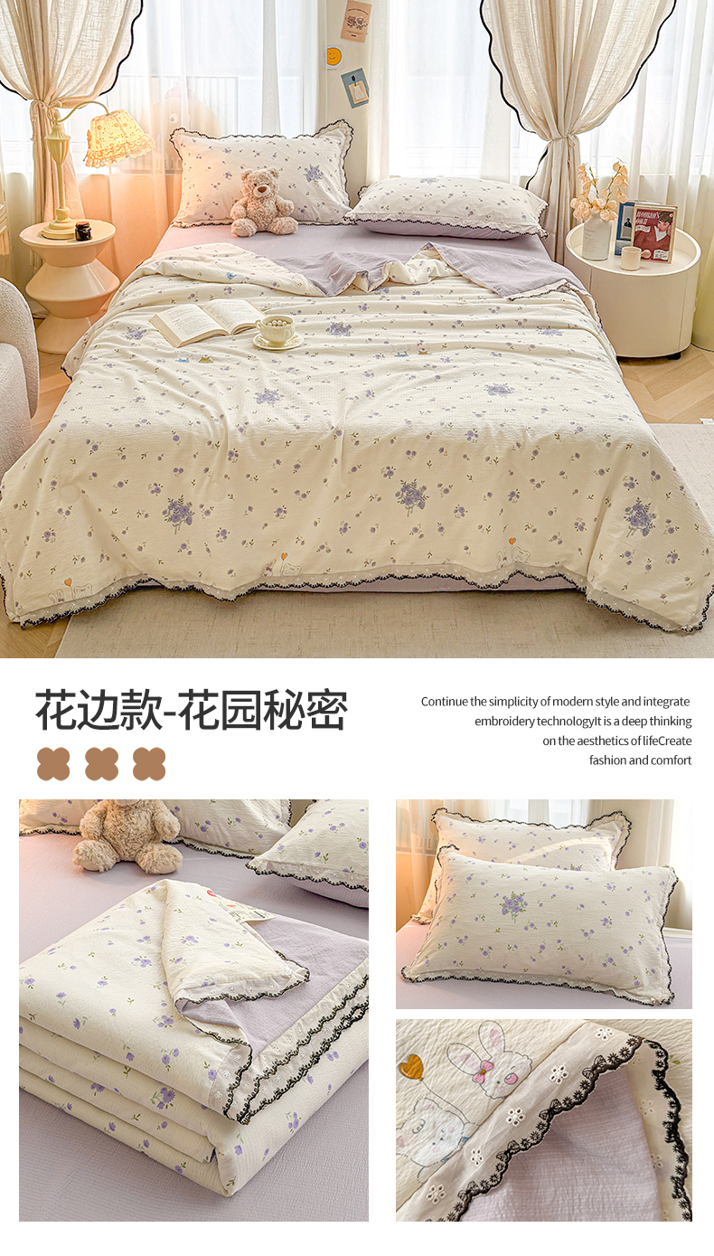 • 91家纺网 家纺一手货源 找家纺 (总)招财星家纺 2026新款A类全棉花边云感双层纱大豆纤维夏被四件套夏被夏凉被空调被(带质检报告买家秀),花边款-金枝玉叶,花边款-缤纷花朵,花边款-草莓气球,花边款-格子木马-蓝,花边款-格子木马-绿,花边款-花季,花边款-花语,花边款-花园秘密,花边款-可爱熊猫,花边款-喇叭花,花边款-绿曼,花边款-萌宠花园,花边款-幸运结-蓝,花边款-幸运结-绿,花边款-长颈鹿