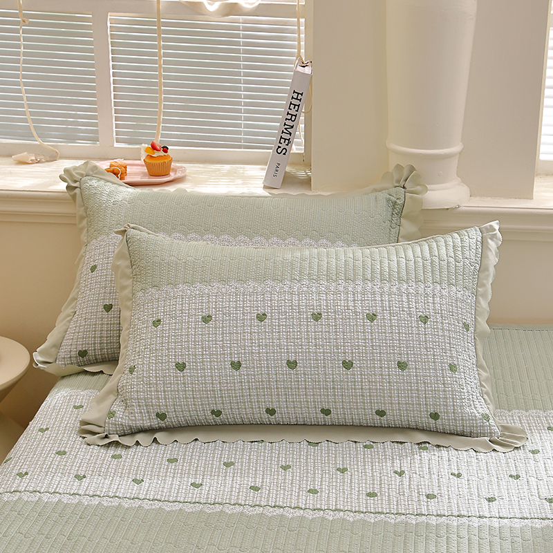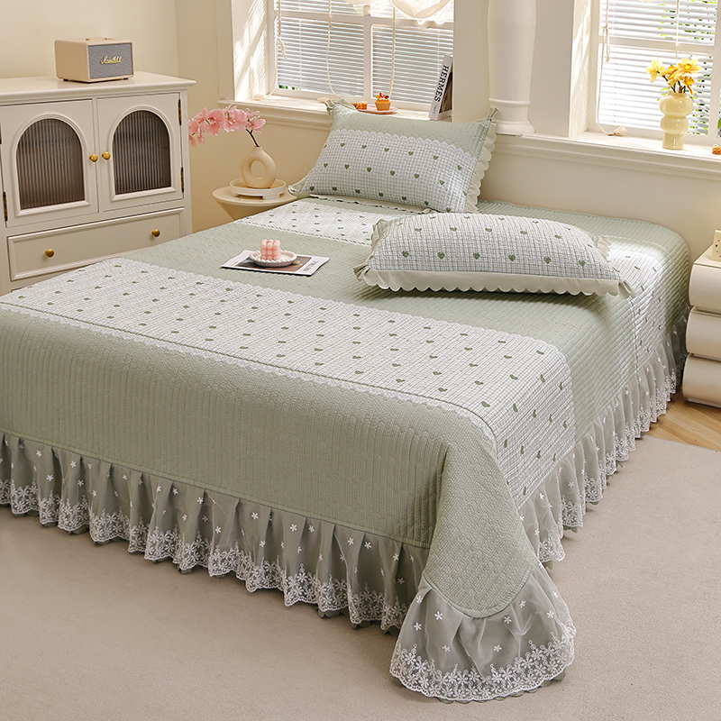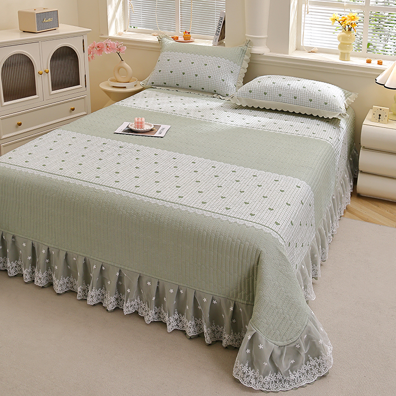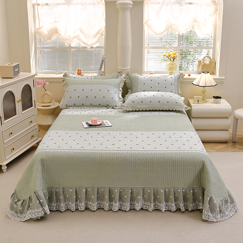 彩亿家纺 2026春夏新品四季床盖泡芙棉双层纱蕾丝床裙加厚床单 甜心绿