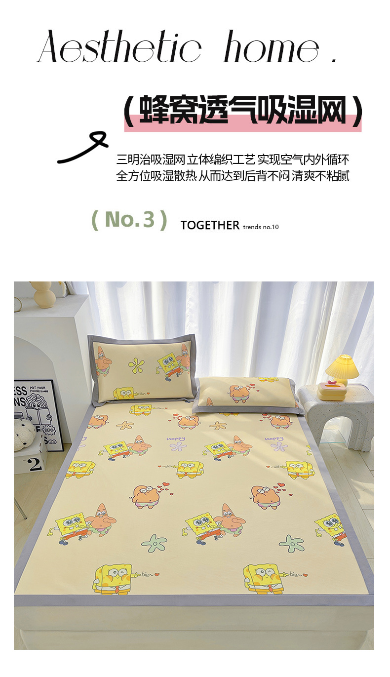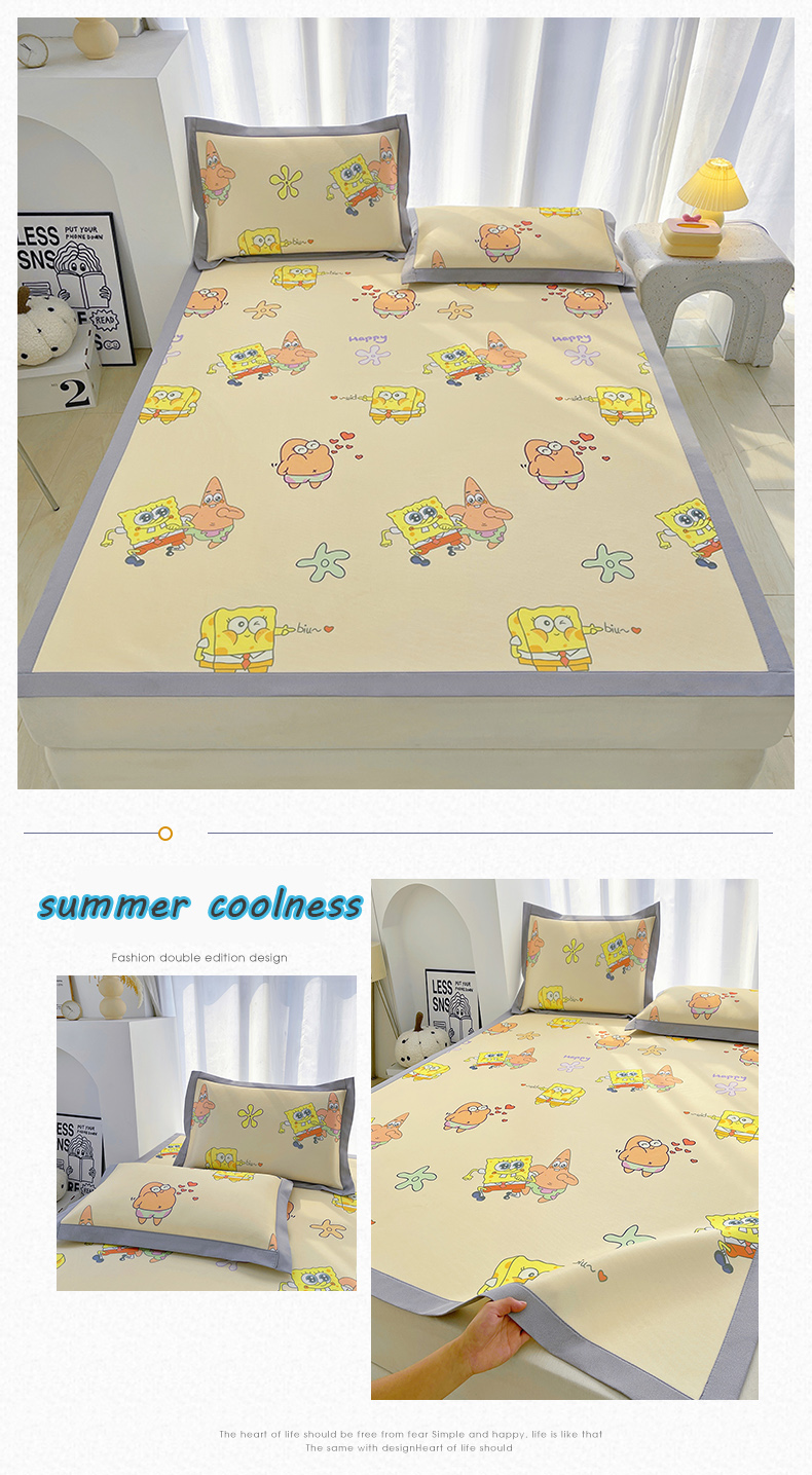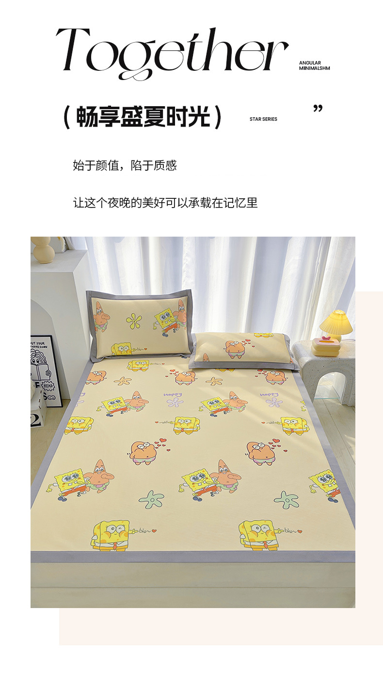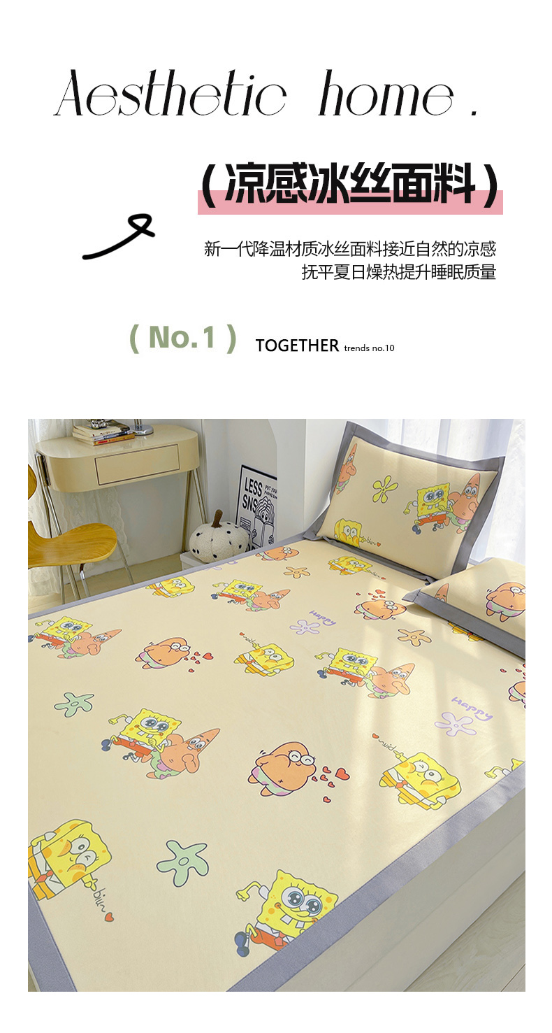 商品名称:云恋家纺 2026正版授权小版冰丝席卡通凉席三件套可折叠水洗软席子儿童单双人凉感空调席子 小版-嘟嘟海绵宝宝