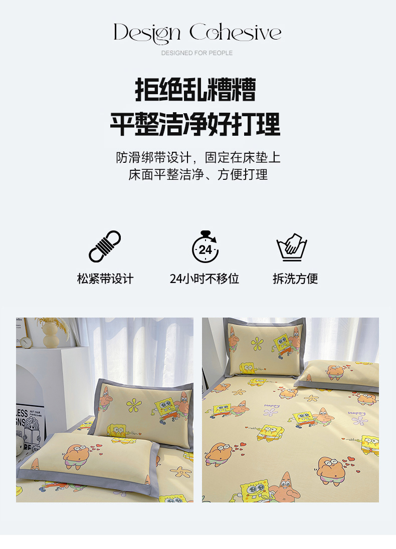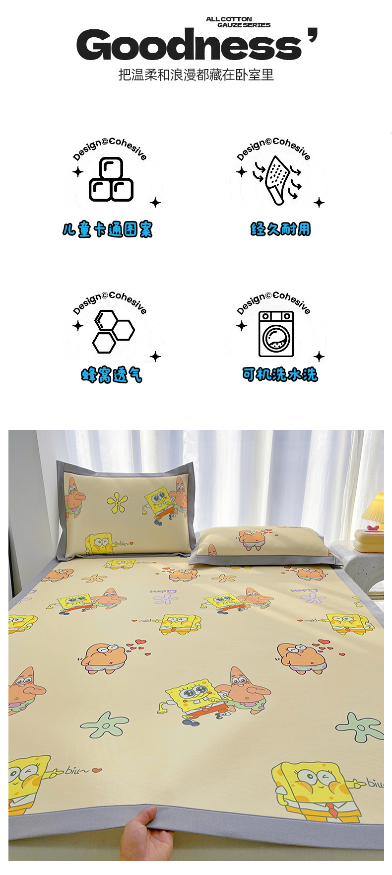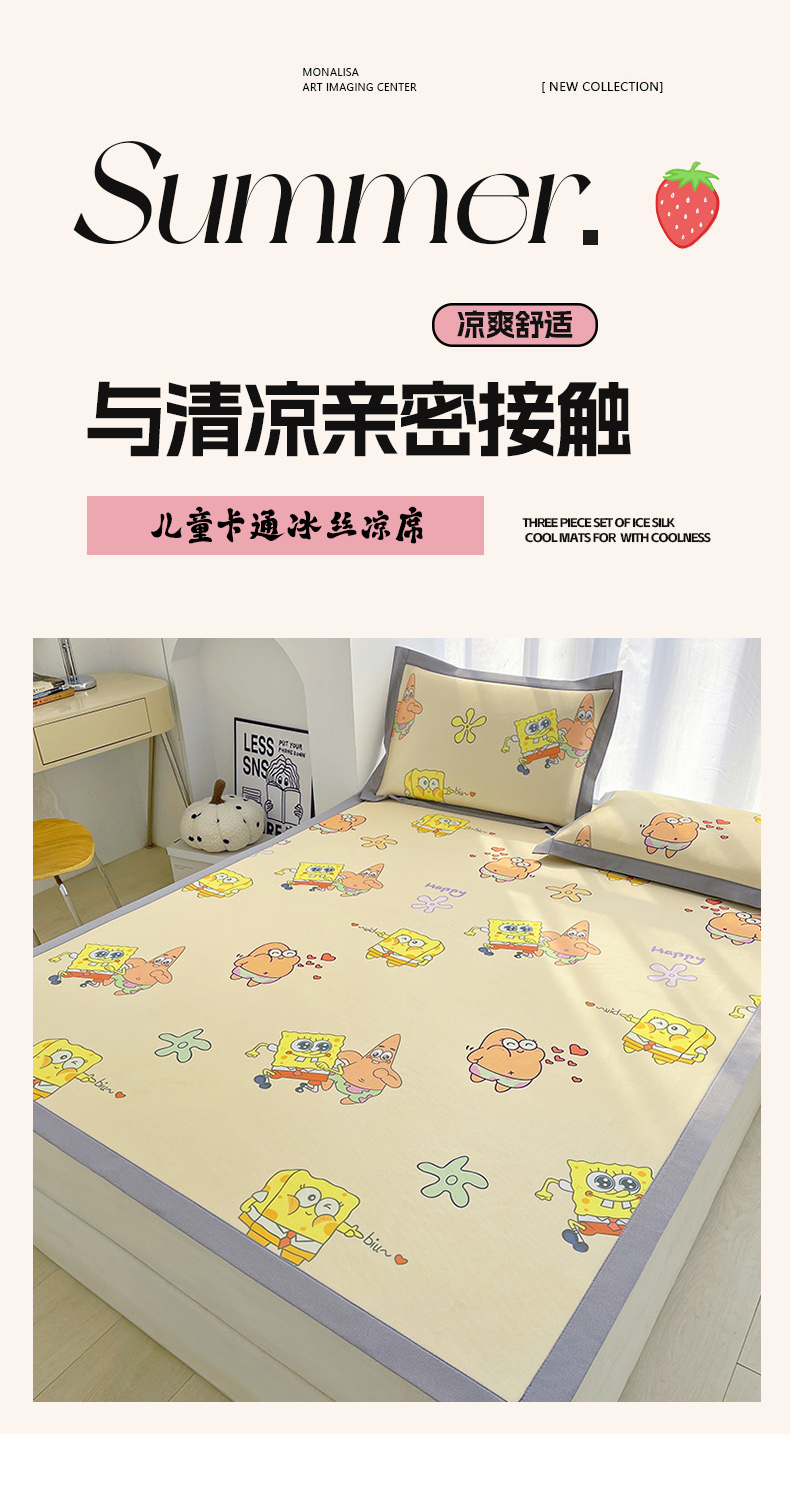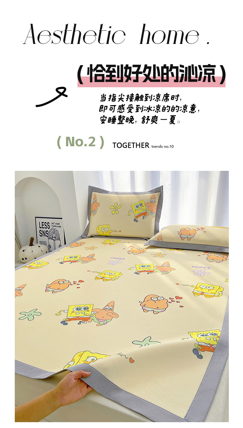 商品名称:云恋家纺 2026正版授权小版冰丝席卡通凉席三件套可折叠水洗软席子儿童单双人凉感空调席子 小版-嘟嘟海绵宝宝