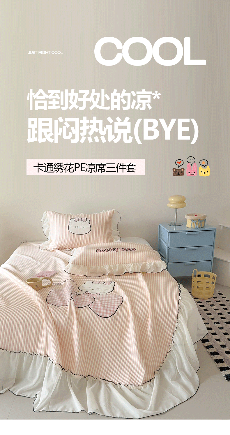 吾欢心 2026新款卡通绣花高克重乙纶PE凉席席子三件套床裙款 甜心喵酱