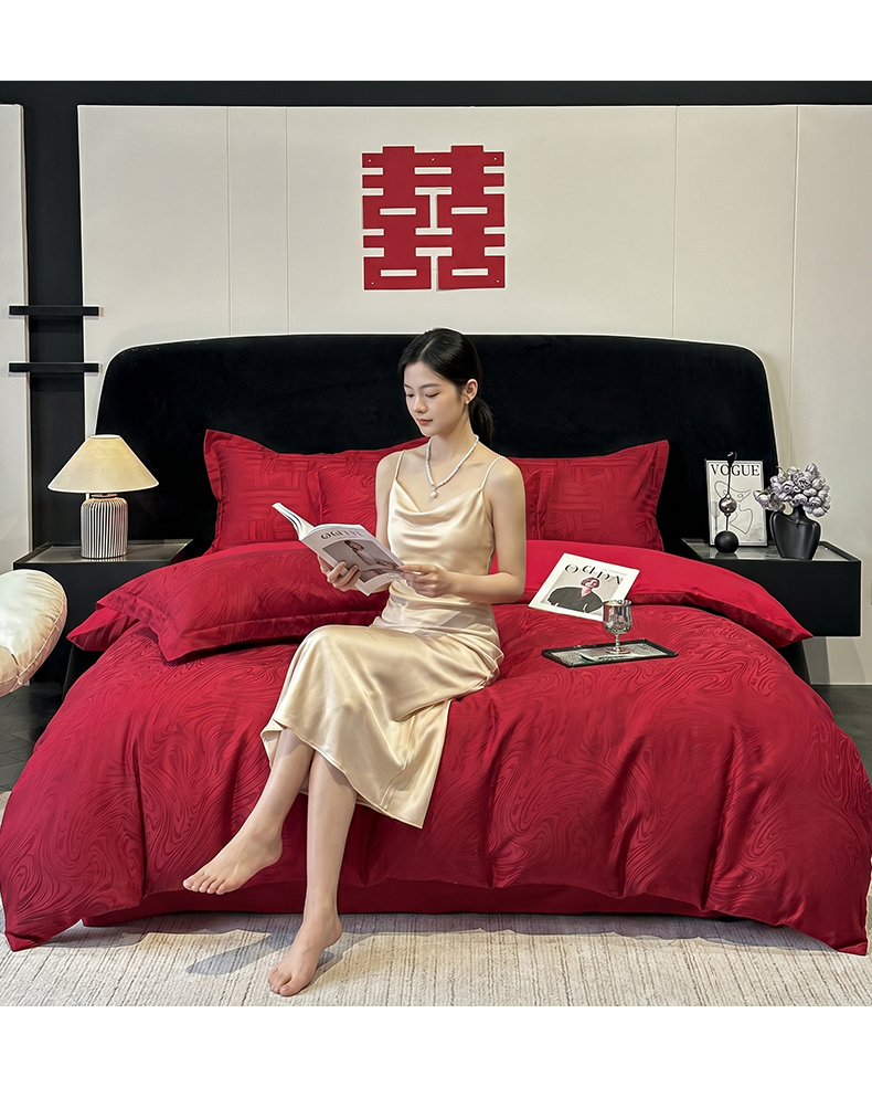 宅家居 2026新款婚庆系列A类A版60支立体浮雕贡缎提花光泽绸缎感B版长绒棉纯棉四件套 凯迪娜-红