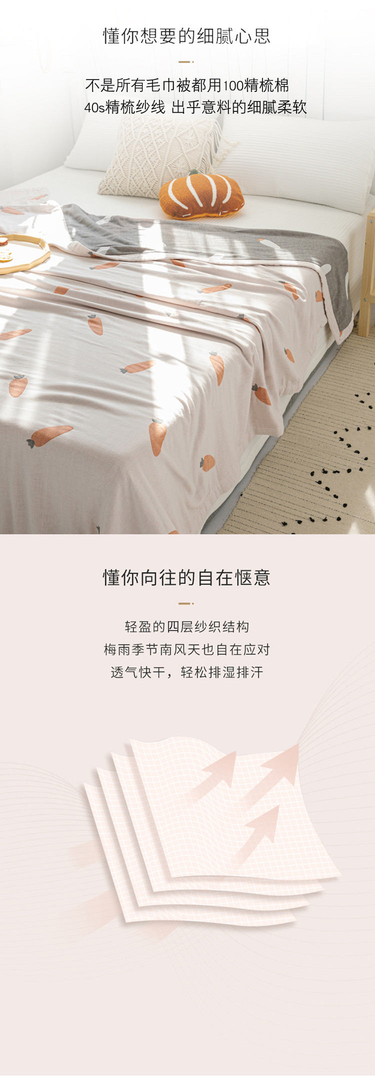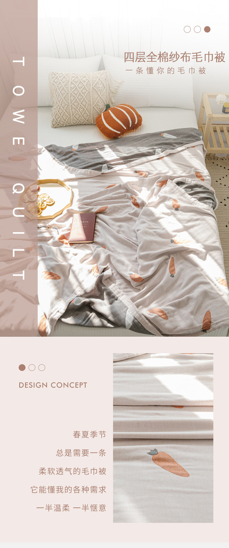 朴尔 2020年新款水果系列四层纱布毛巾被 悠然胡萝卜-米灰