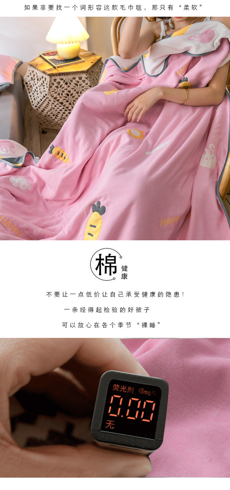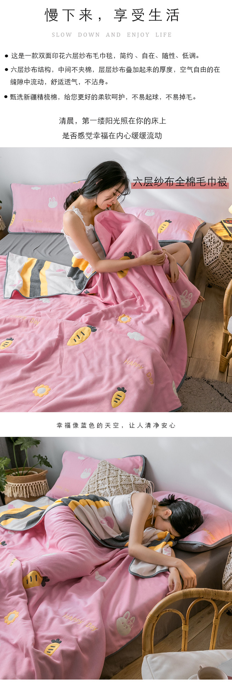 朴尔2020新款时尚六层全棉纱布盖毯夏季毛巾被兔与胡萝卜-粉