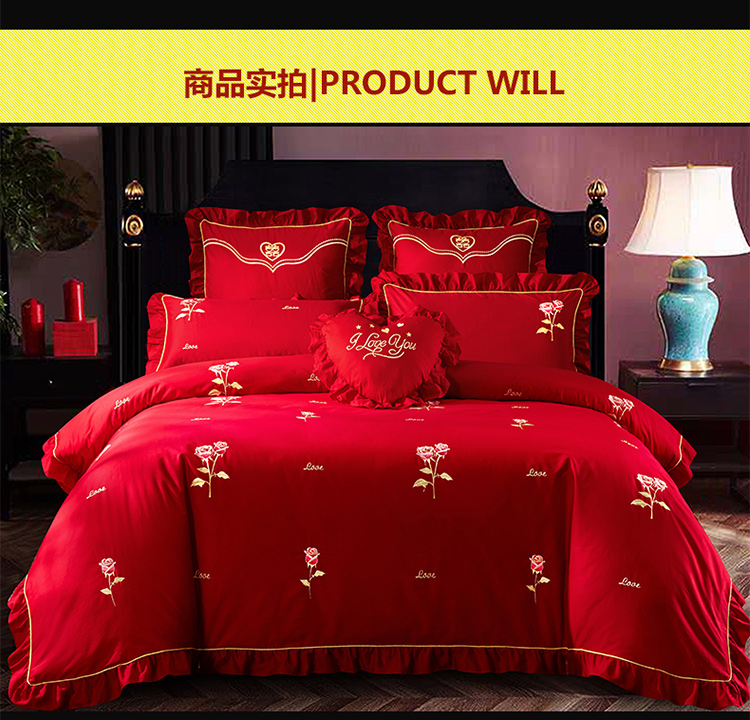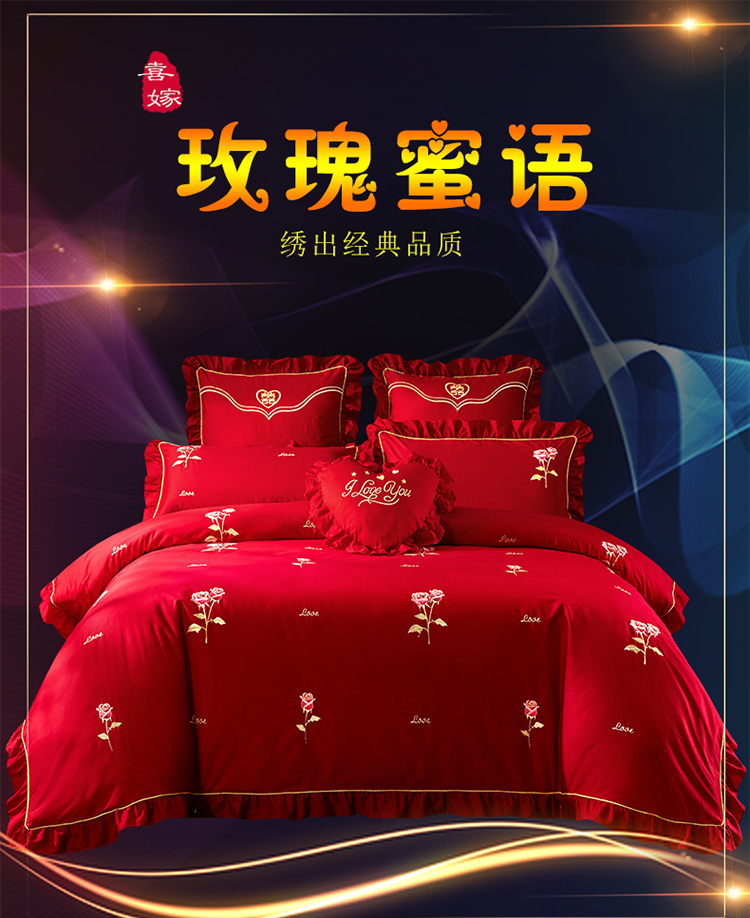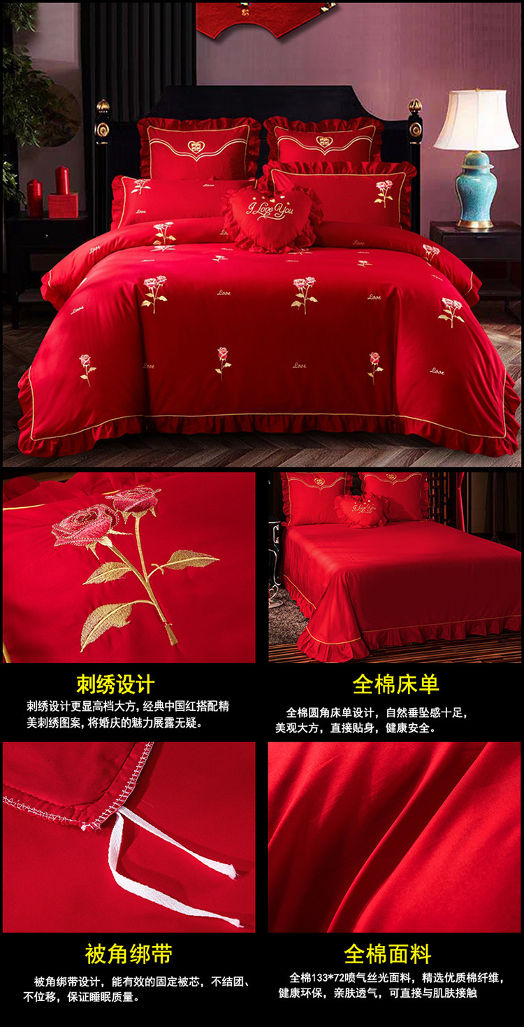 慕她 婚庆四件套大红色刺绣全棉纯棉结婚多件套玫瑰蜜语