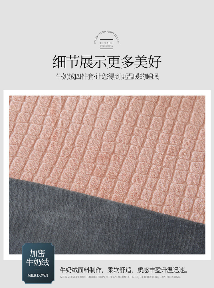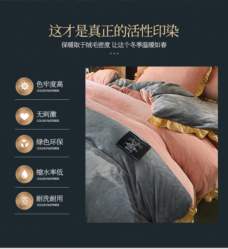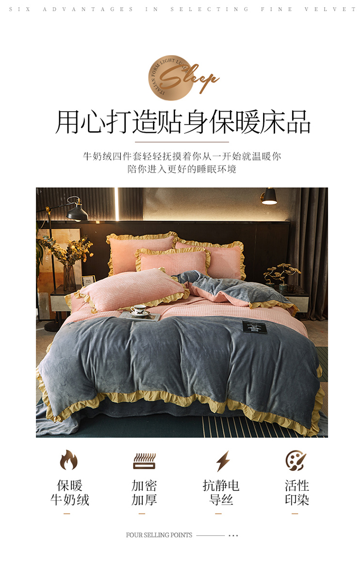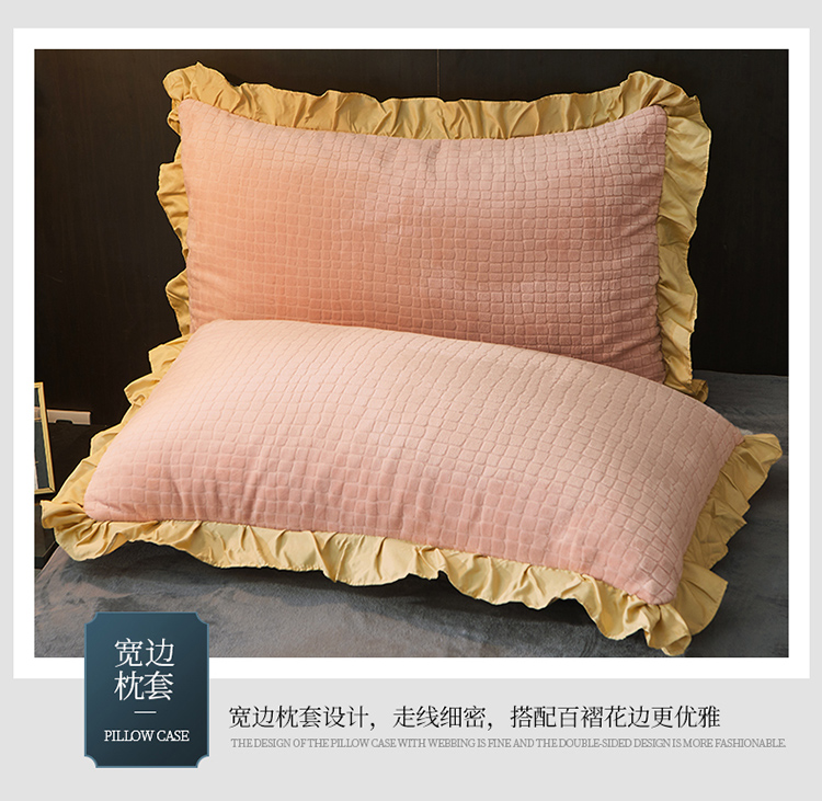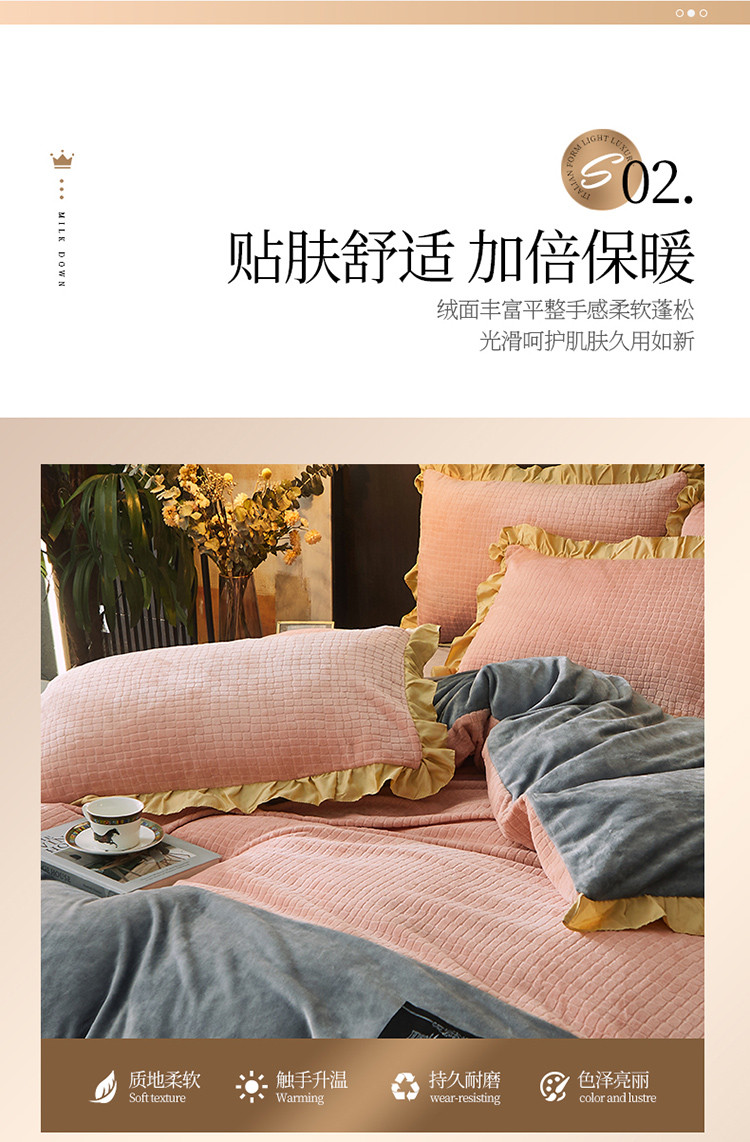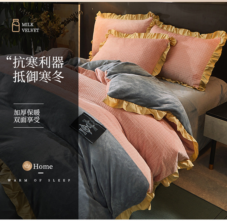 商品名称:芃成家纺 2021新款牛奶绒双拼花边四件套水立方双拼花边玉色
