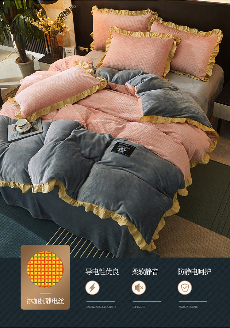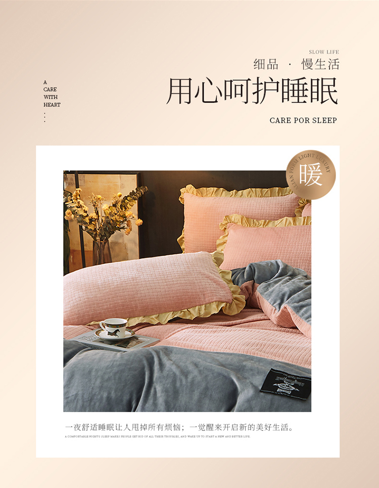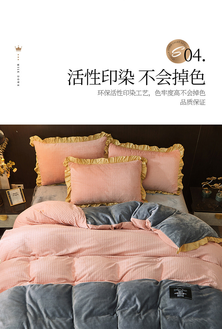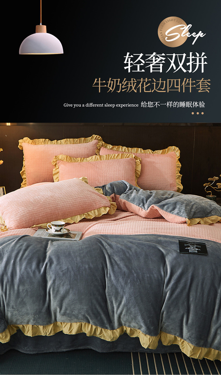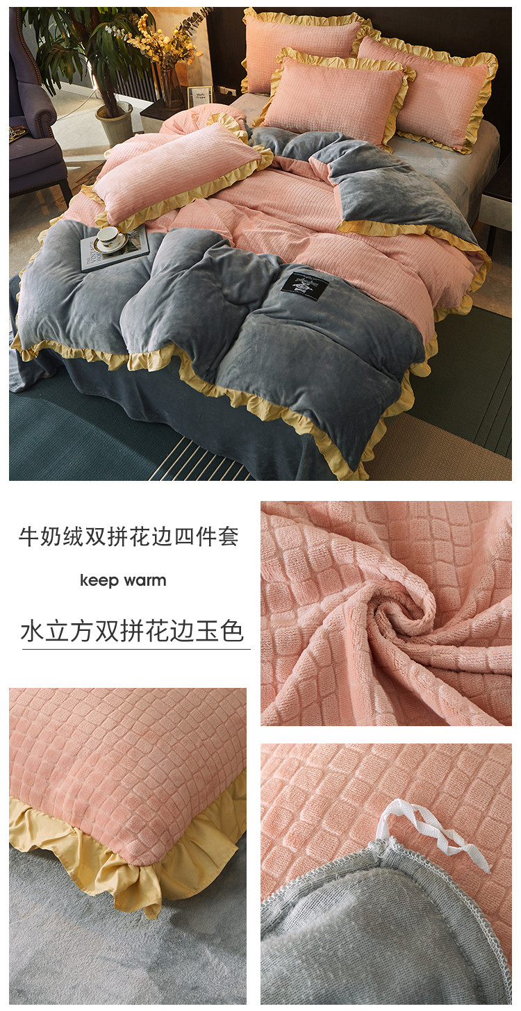 芃成家纺 2021新款牛奶绒双拼花边四件套水立方双拼花边玉色