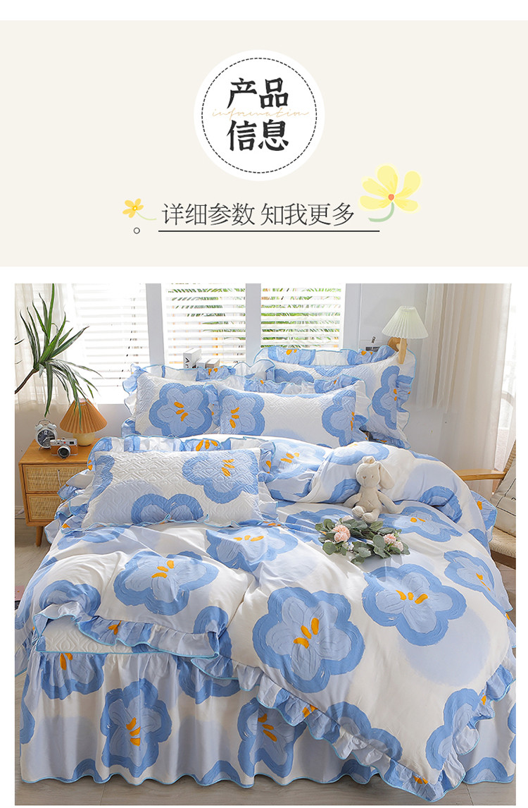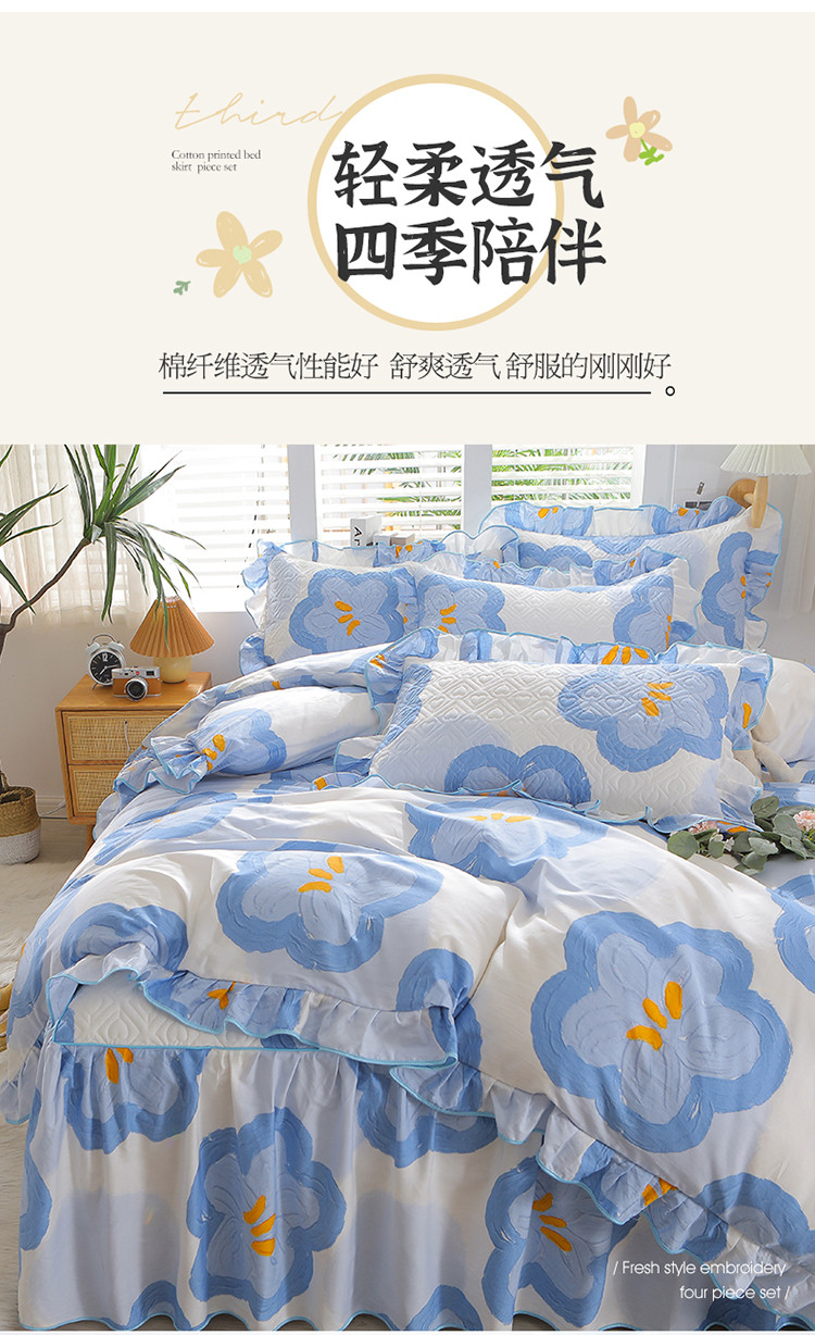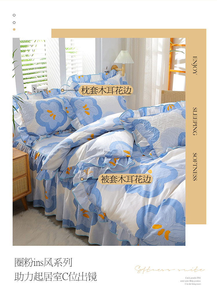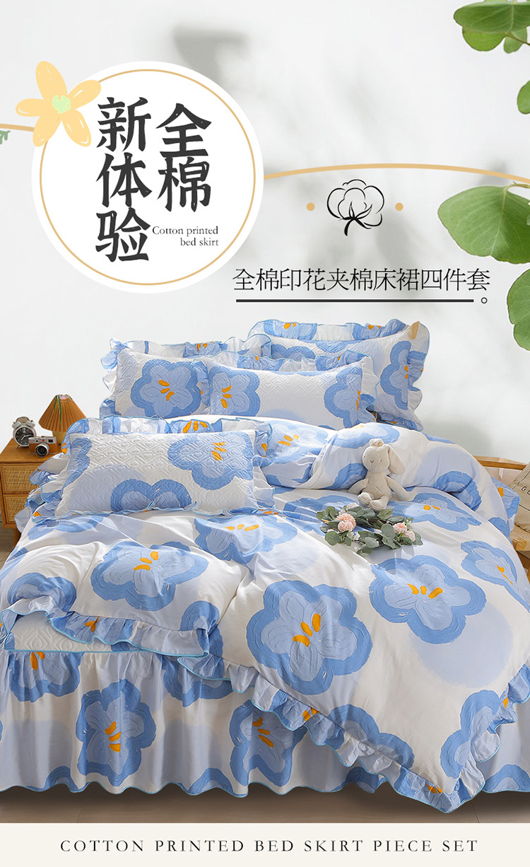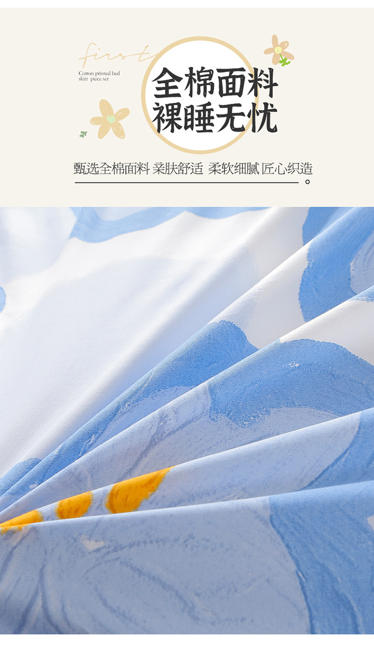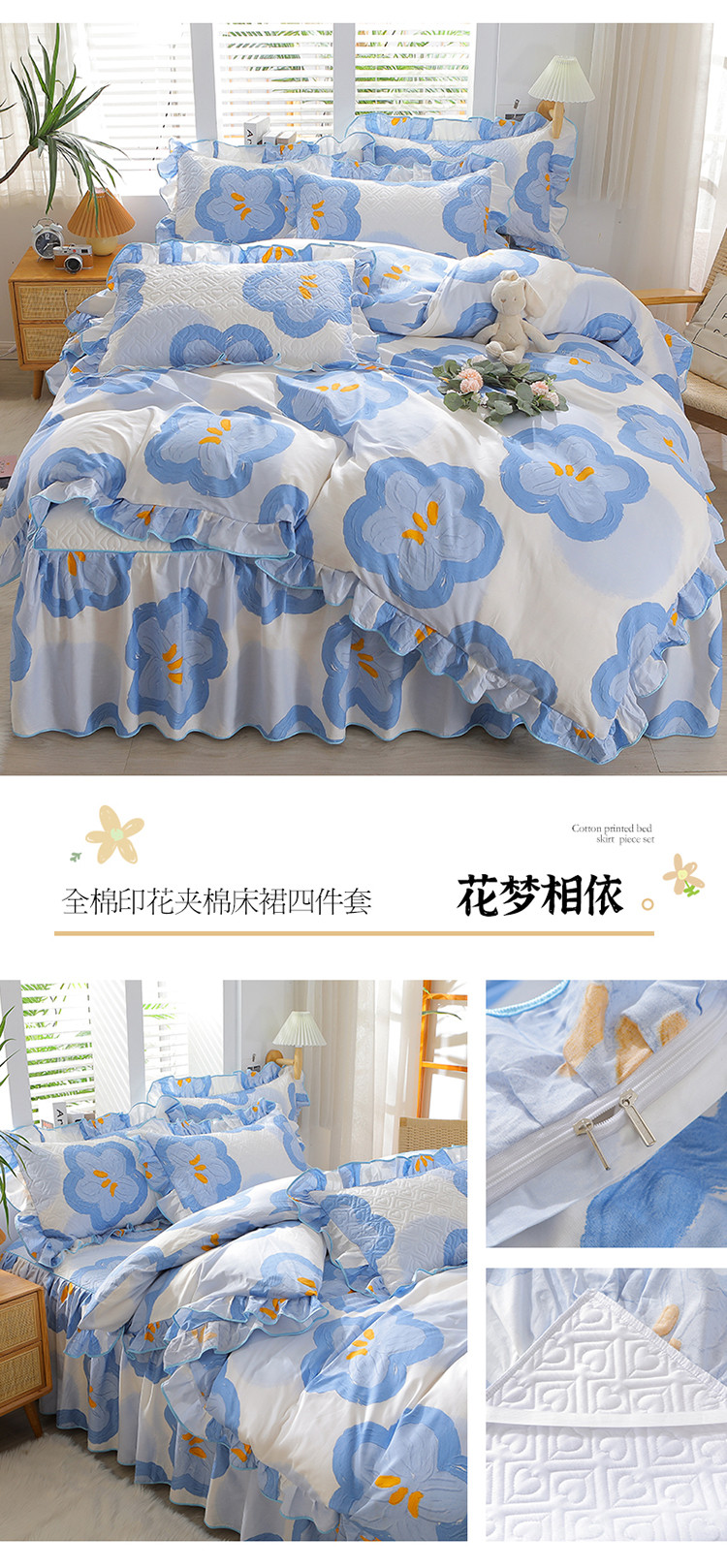当前位置: 91家纺网 > 商品网购 > 床品套件 > 四件套 > 全棉普通四件套 > 宜凡家纺 2023新款全棉印花花边床裙四件套 花梦相依