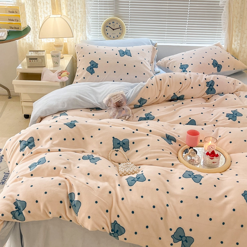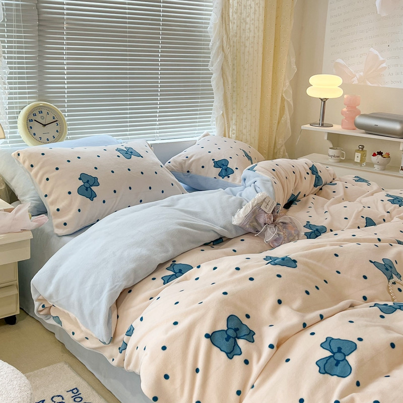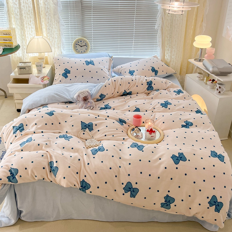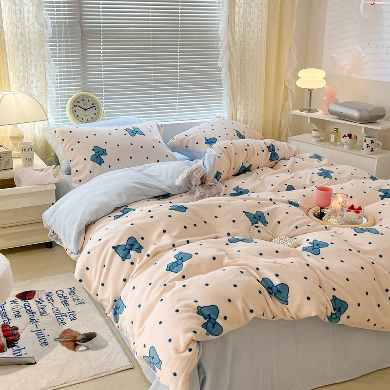 昔可 2022新款牛奶绒少女小清新系列四件套 蓝波点蝴蝶结