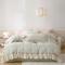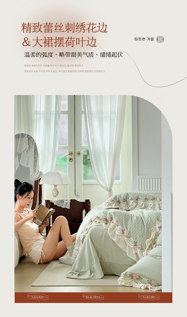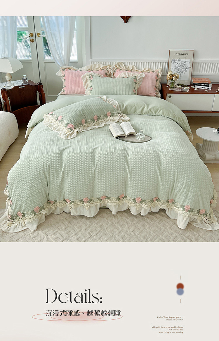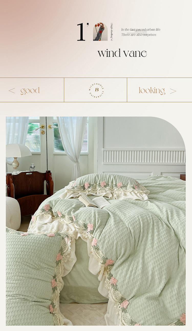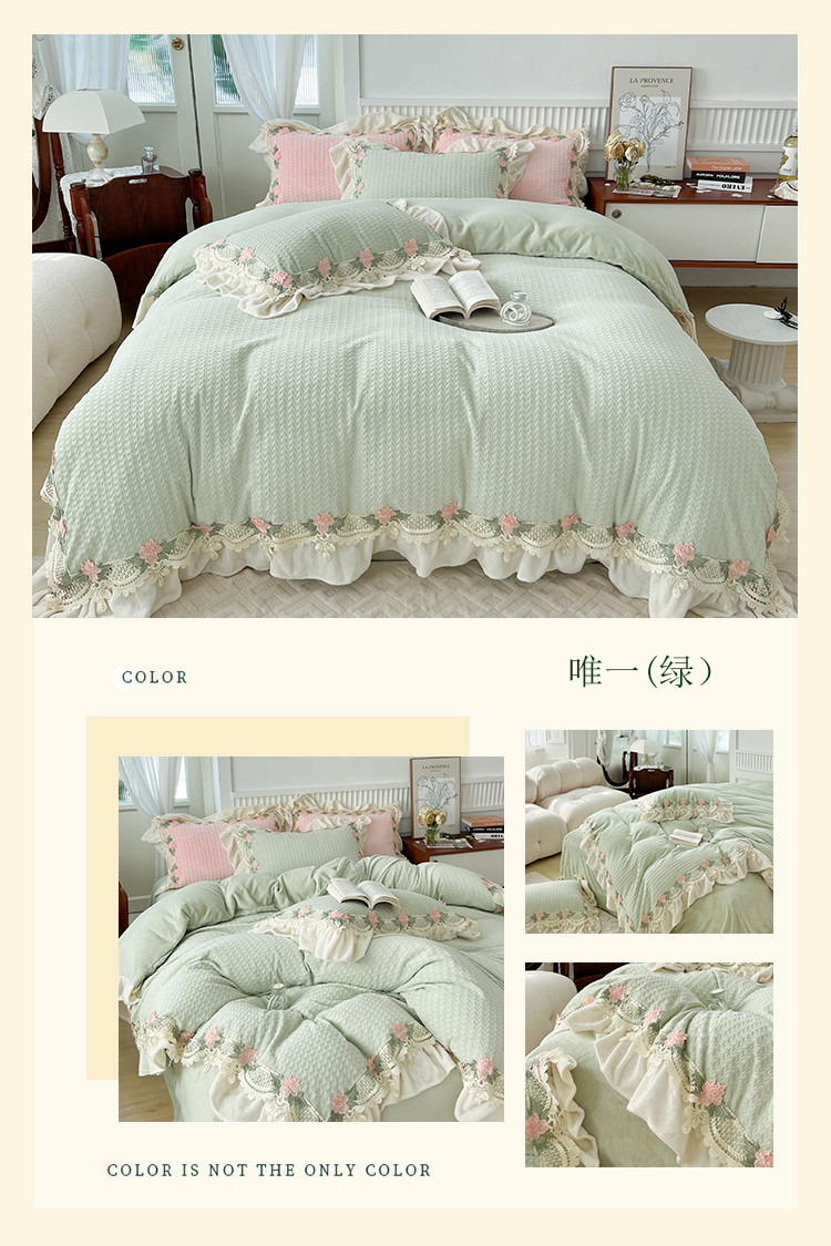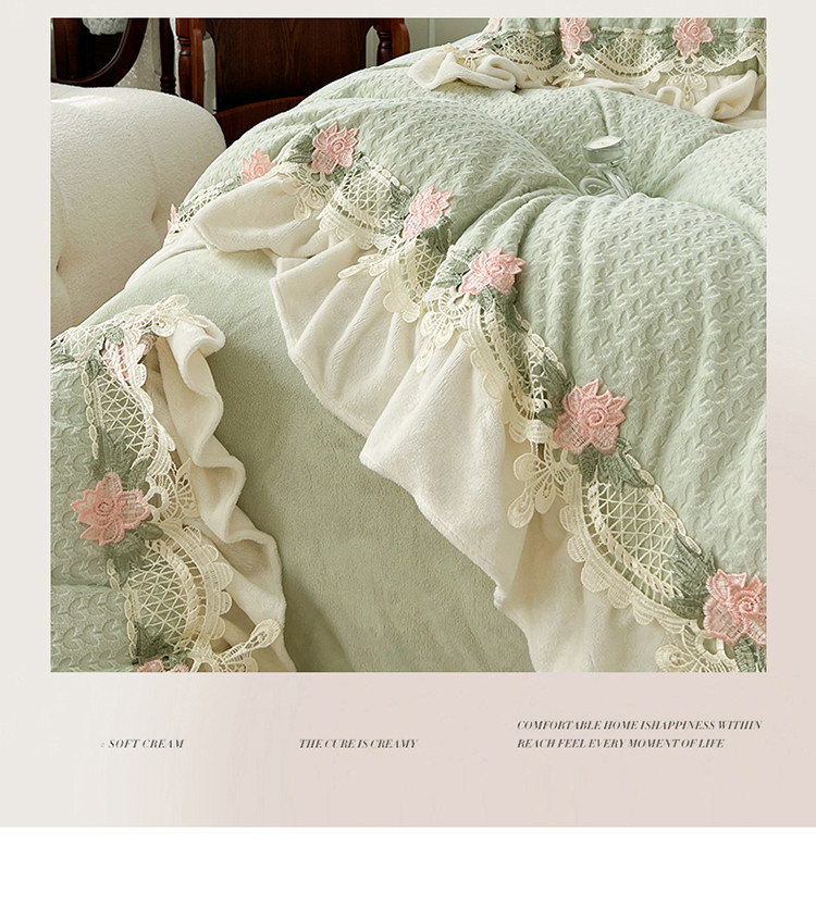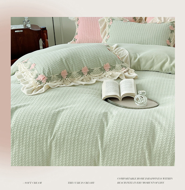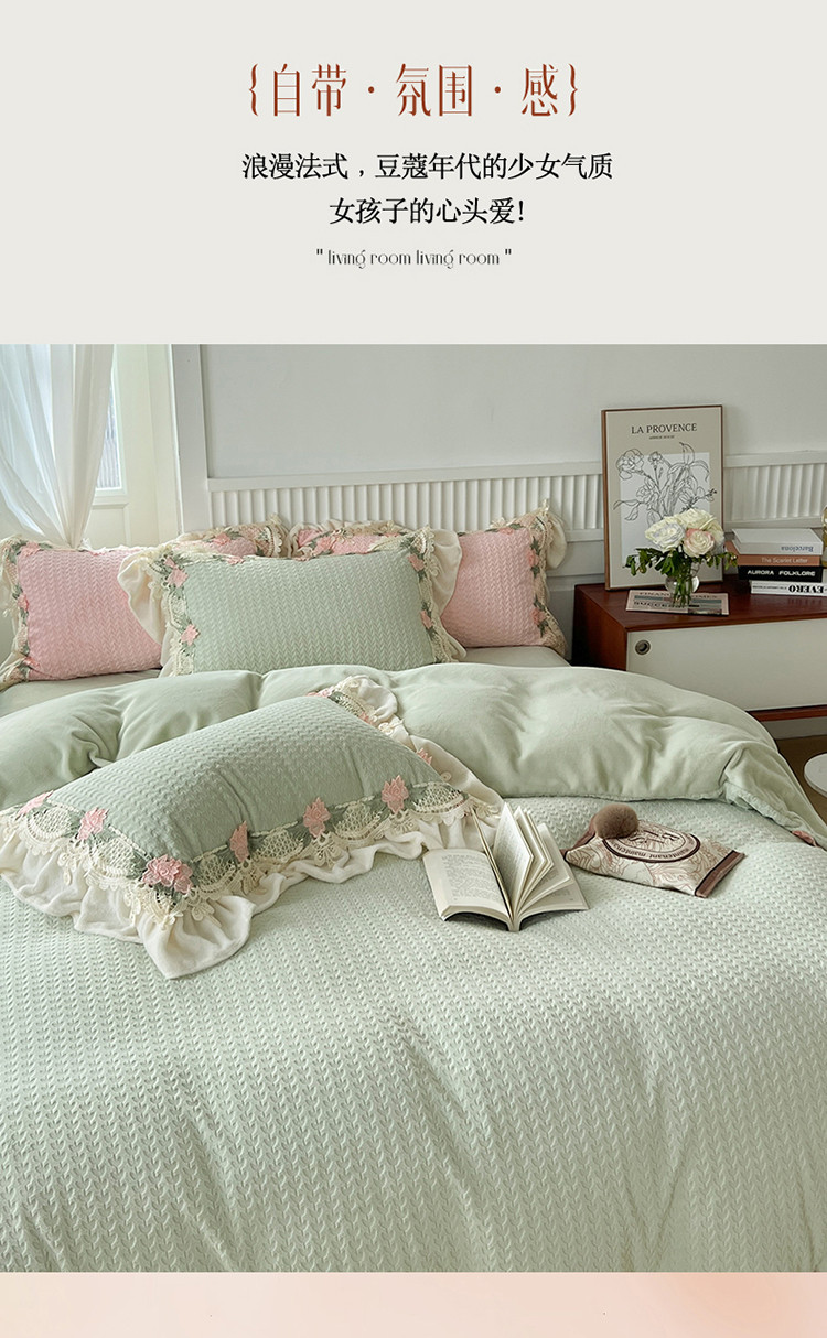 商品名称:玛奇朵 高定蕾丝边全消光云芙暖绒四件套-唯 一(场景2) 唯一-绿