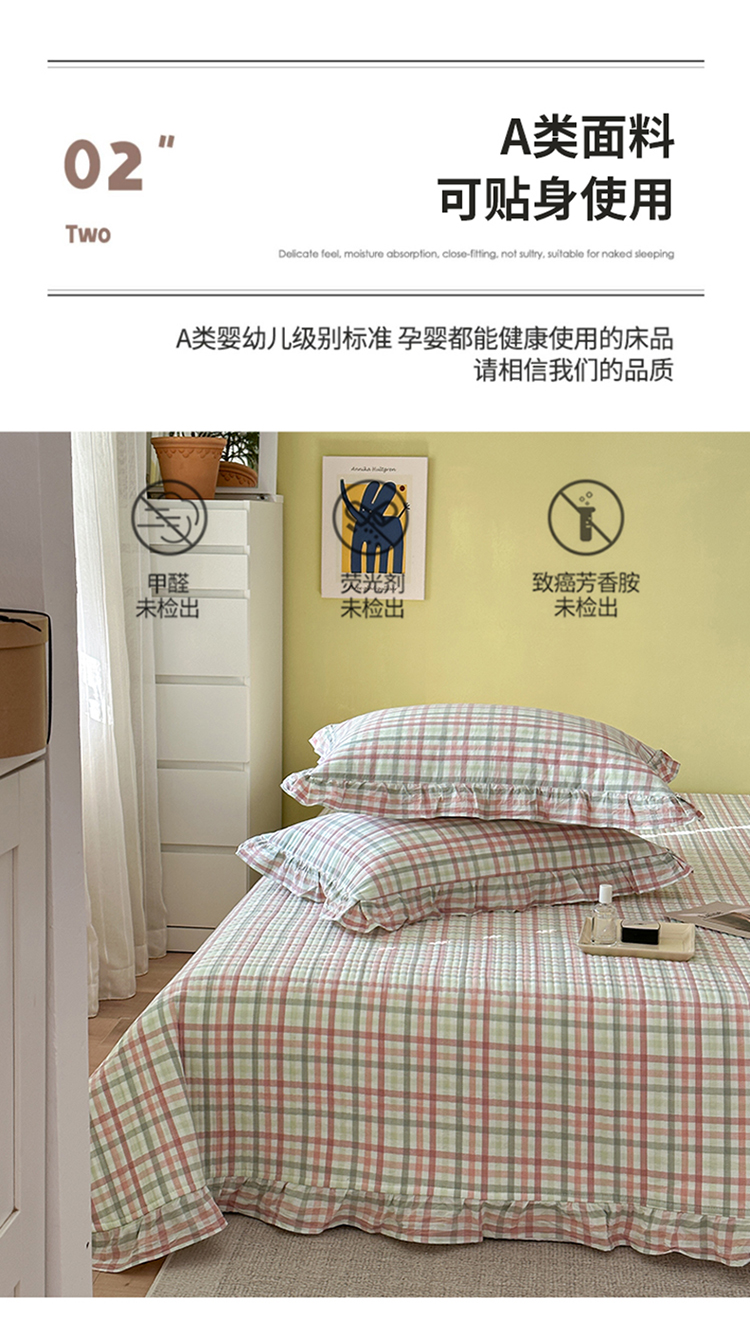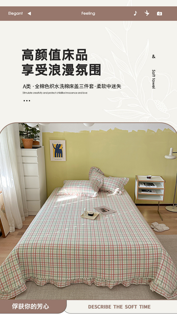 2022新款40S纯棉水洗棉全棉荷叶边夹棉床盖三件套青草绿,青草绿