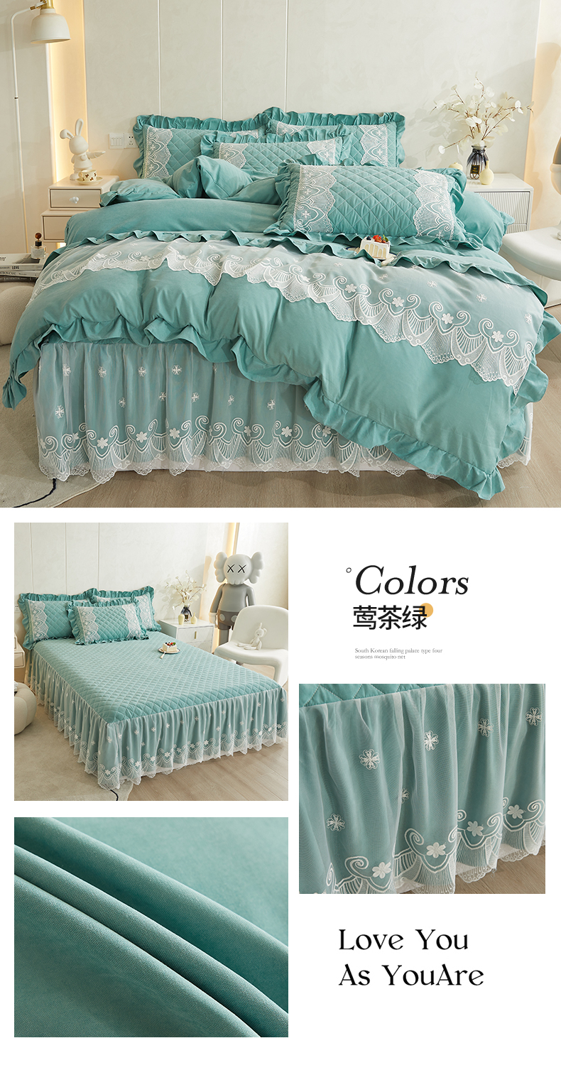 当前位置: 91家纺网 > 商品网购 > 床品套件 > 四件套 > 普通磨毛四件套 > 网红馆 2025新款亲肤蕾丝床裙四件套-梦想生活 莺茶绿