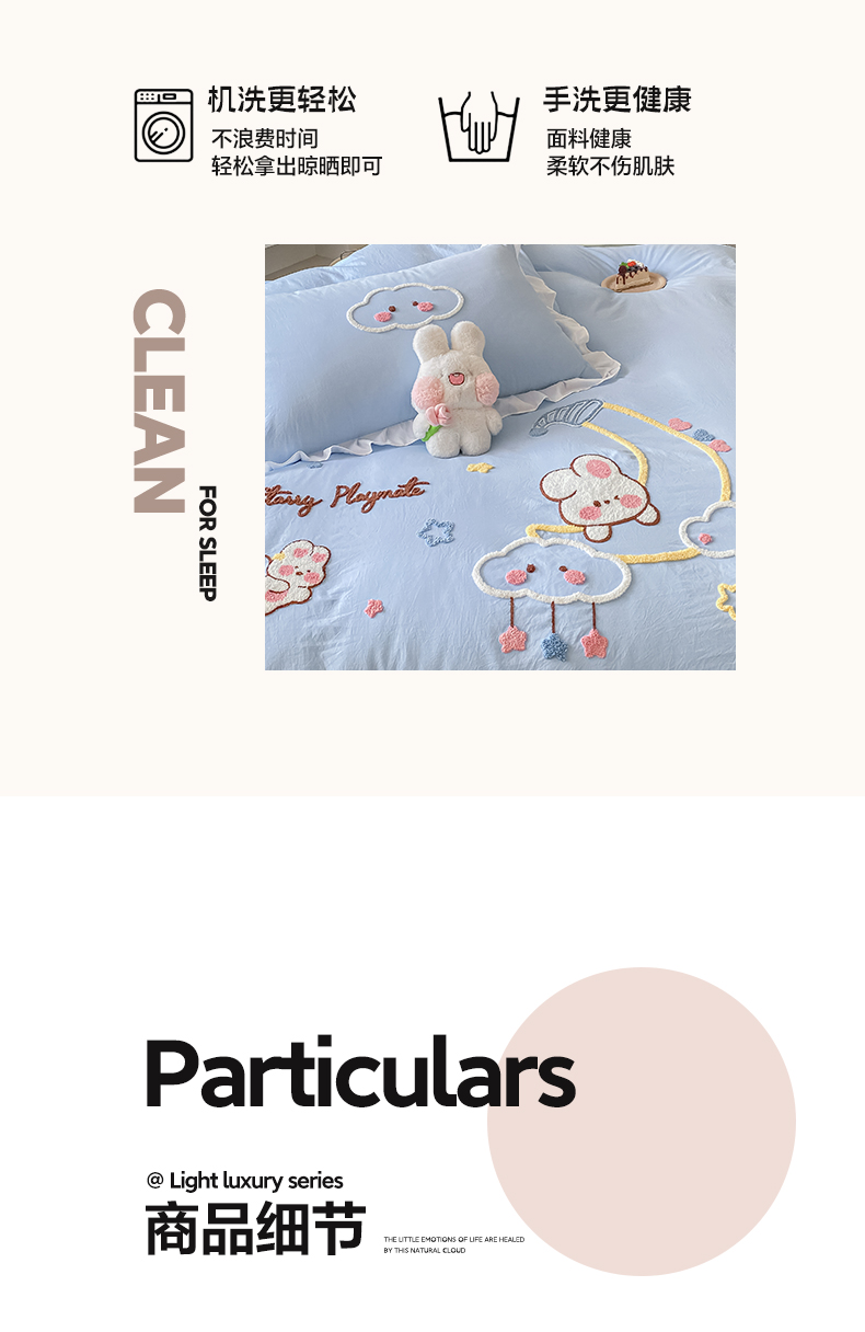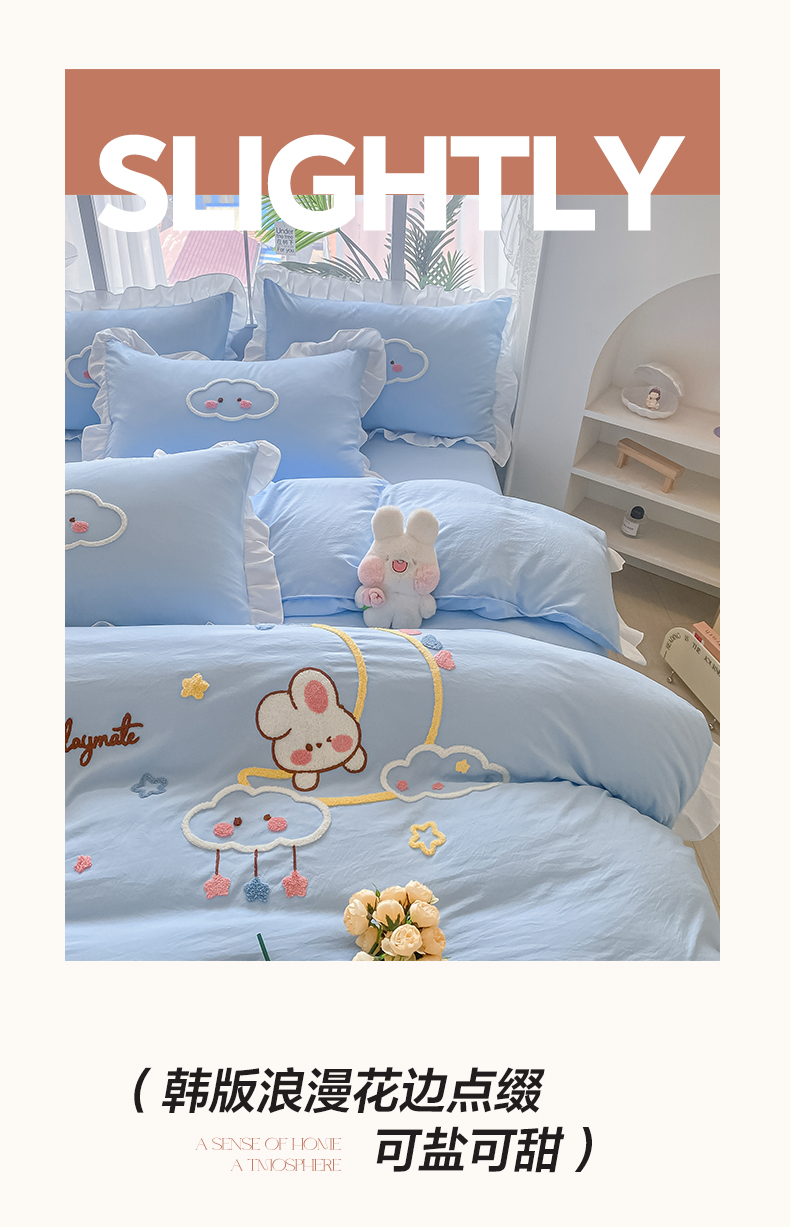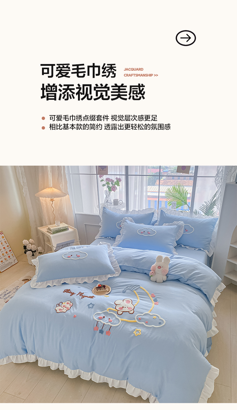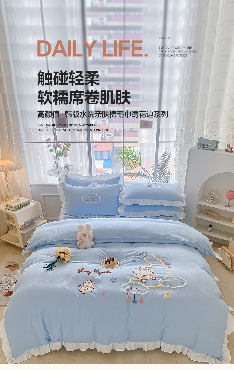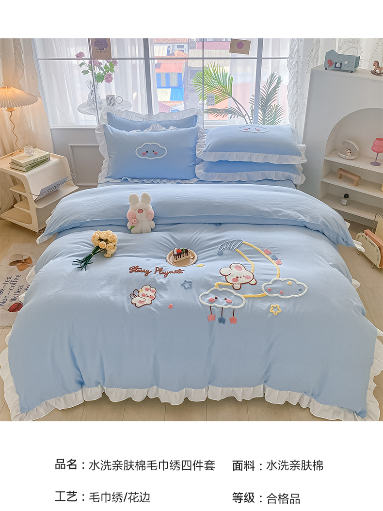 当前位置: 91家纺网 > 商品网购 > 床品套件 > 四件套 > 化纤活性四件套 > 易禾家纺 2024新款水洗棉毛巾绣晚安梦四件套专版花型 晚安梦-蓝