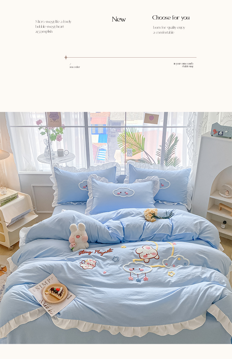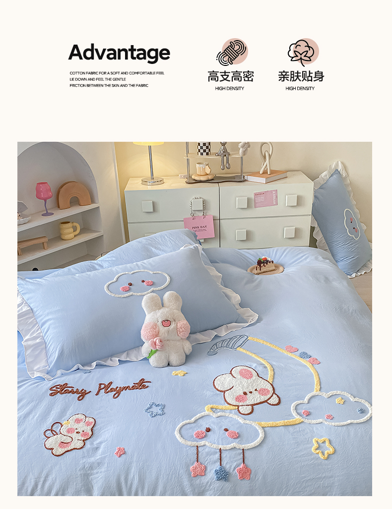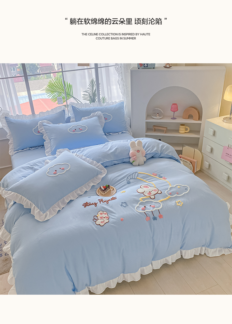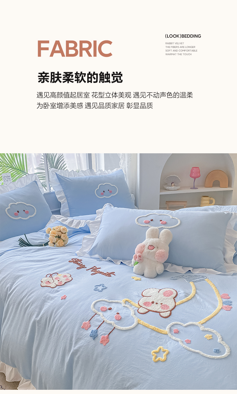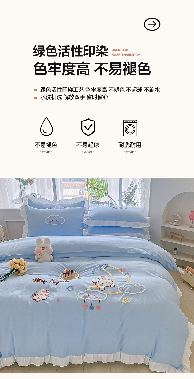 当前位置: 91家纺网 > 商品网购 > 床品套件 > 四件套 > 化纤活性四件套 > 易禾家纺 2024新款水洗棉毛巾绣晚安梦四件套专版花型 晚安梦-蓝