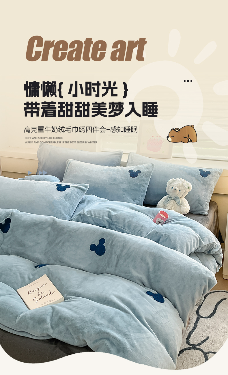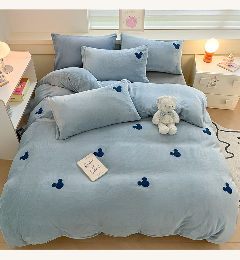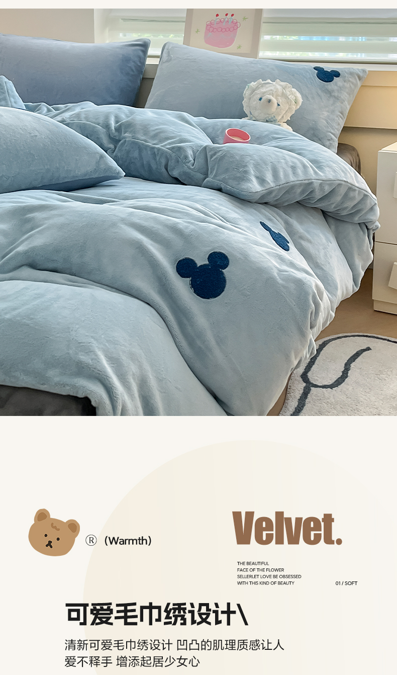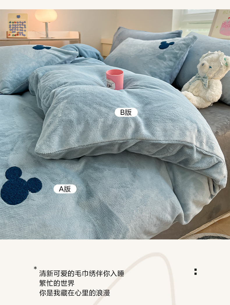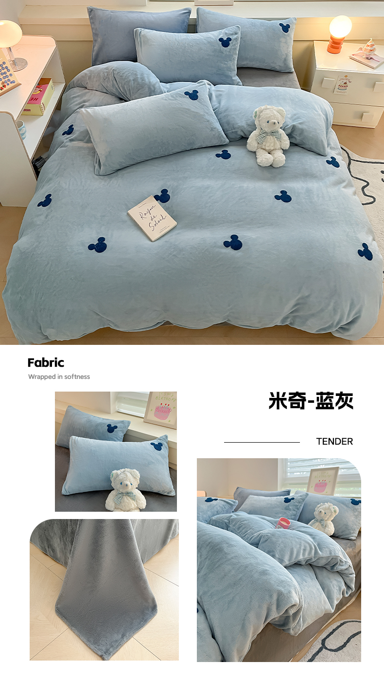 雅居纺 2023新款200克毛巾绣牛奶绒四件套-小熊米奇系列 米奇-蓝灰
