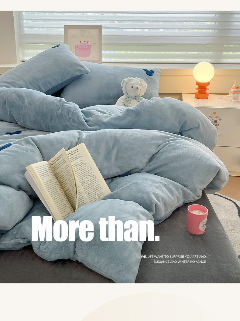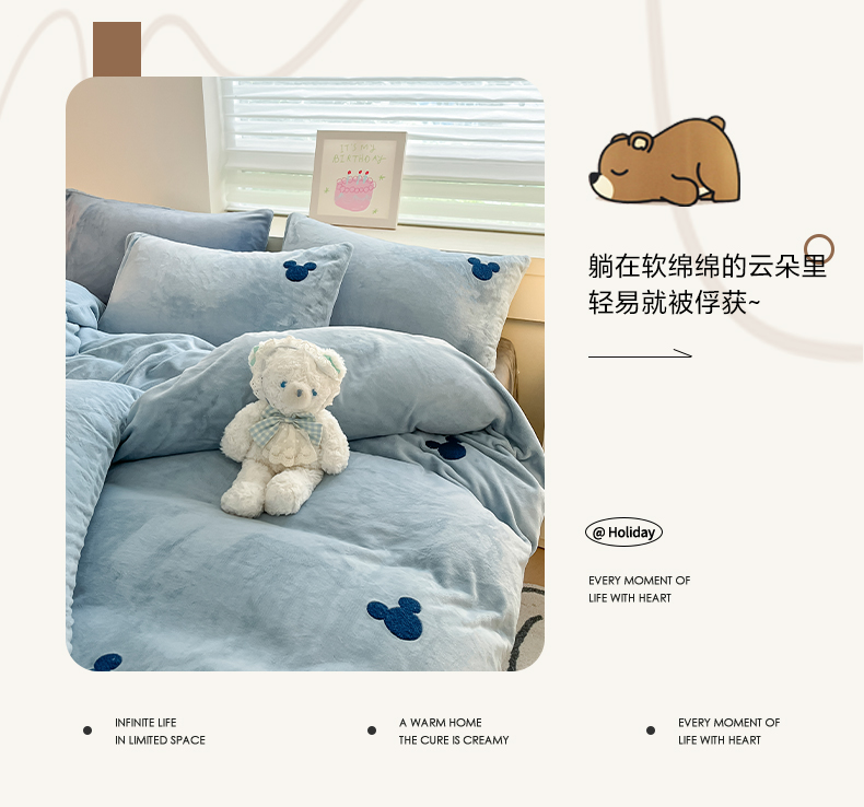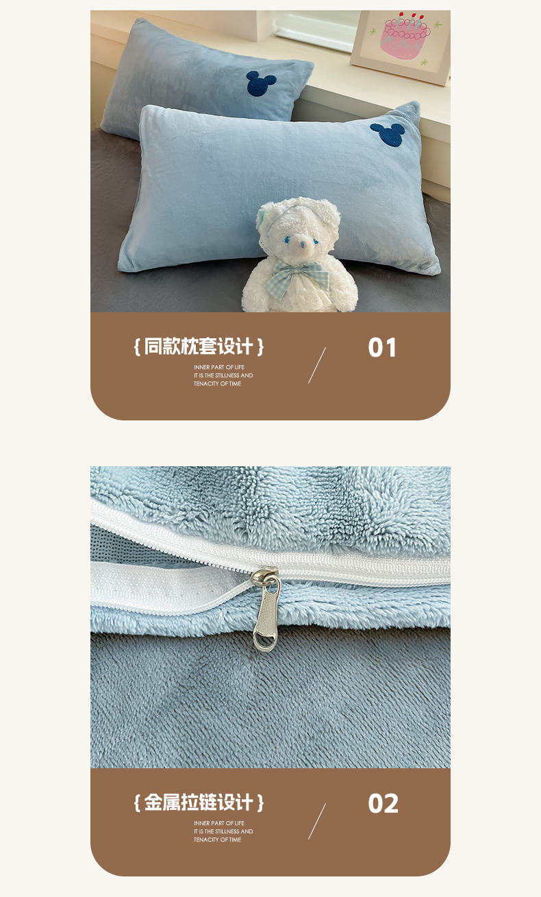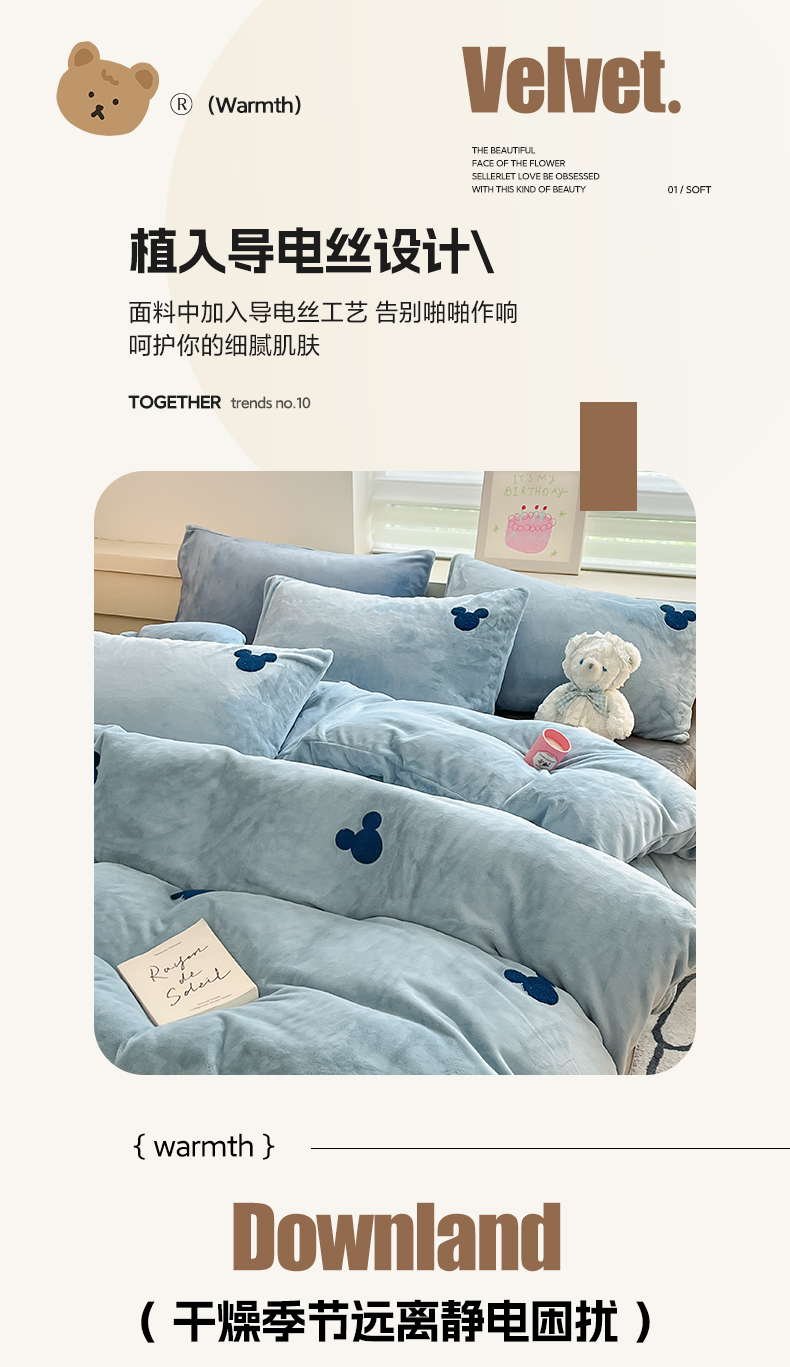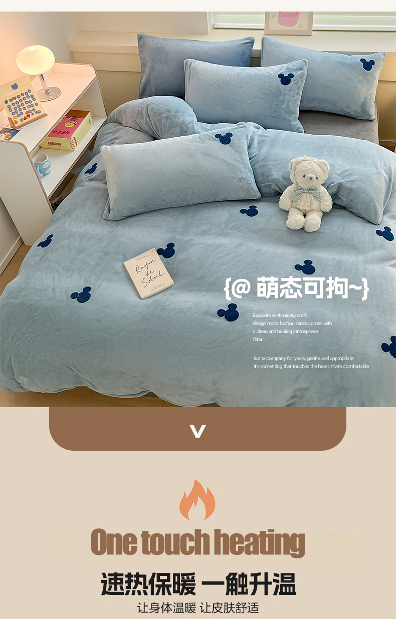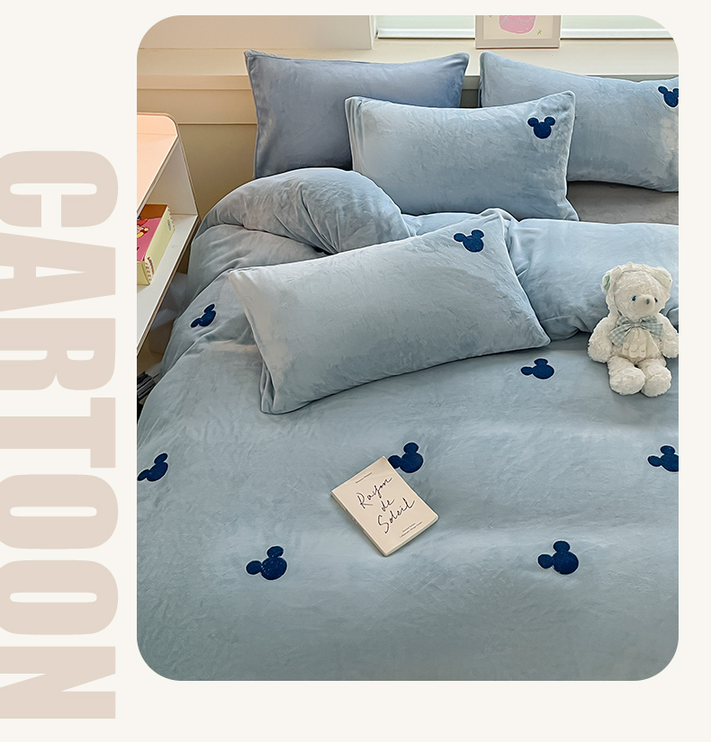 雅居纺 2023新款200克毛巾绣牛奶绒四件套-小熊米奇系列 米奇-蓝灰