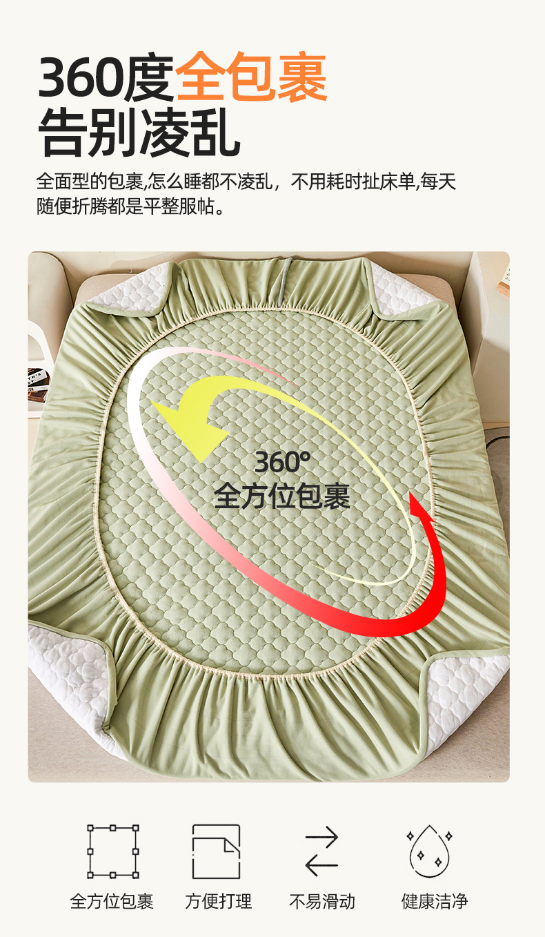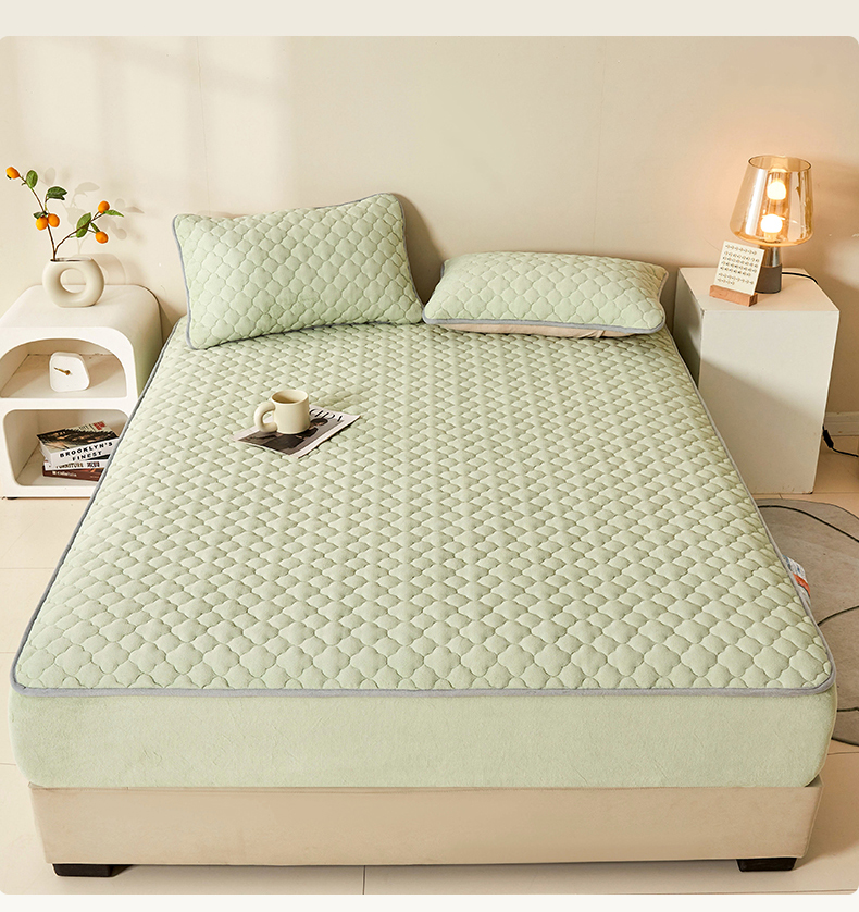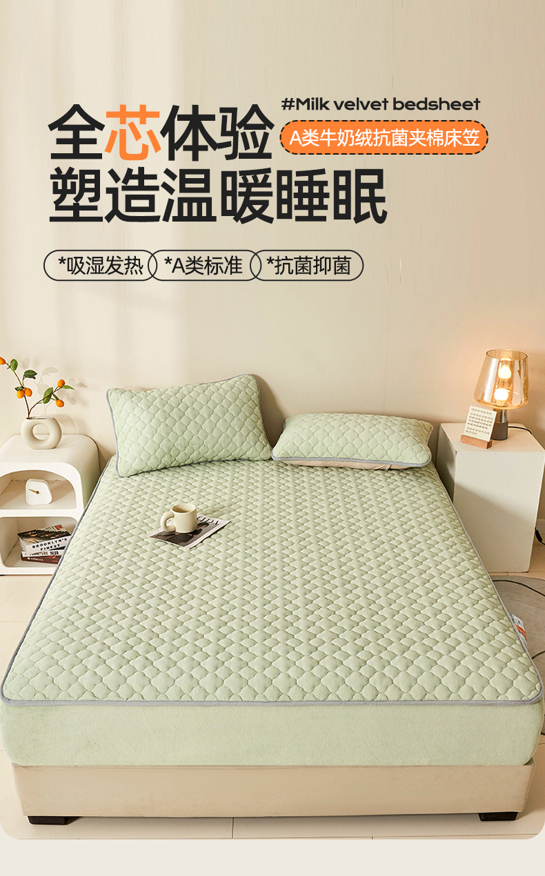 雯豆 2023新品纯色牛奶绒夹棉床笠床垫保护套A类保暖加厚床笠 牛奶绒床笠-嫩绿