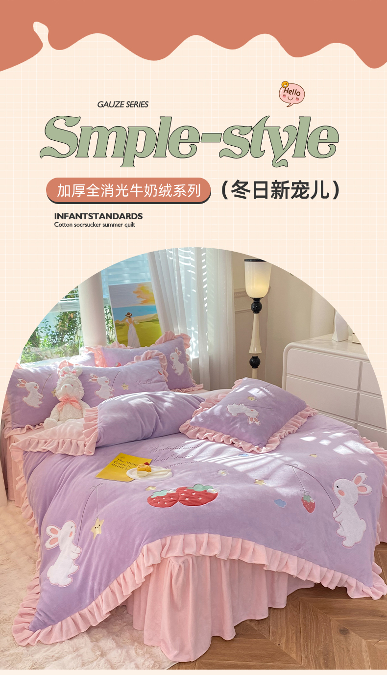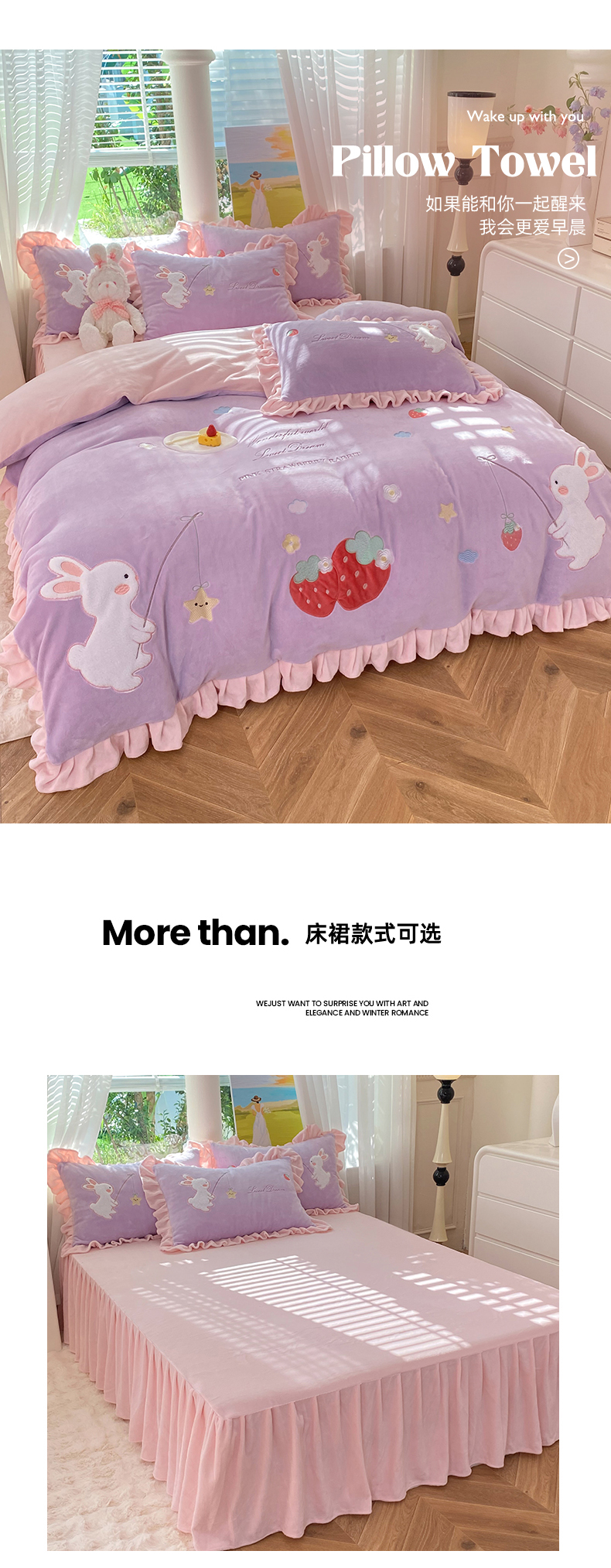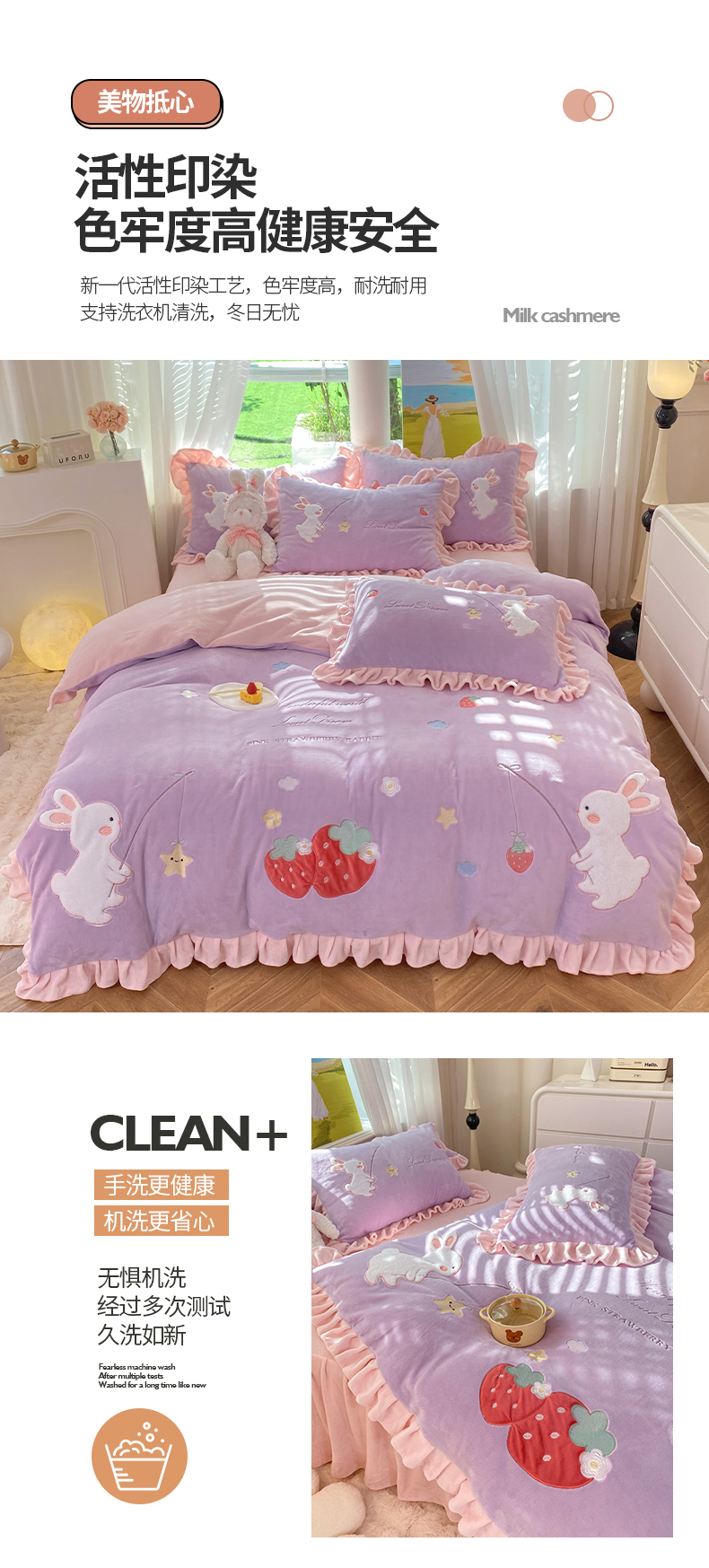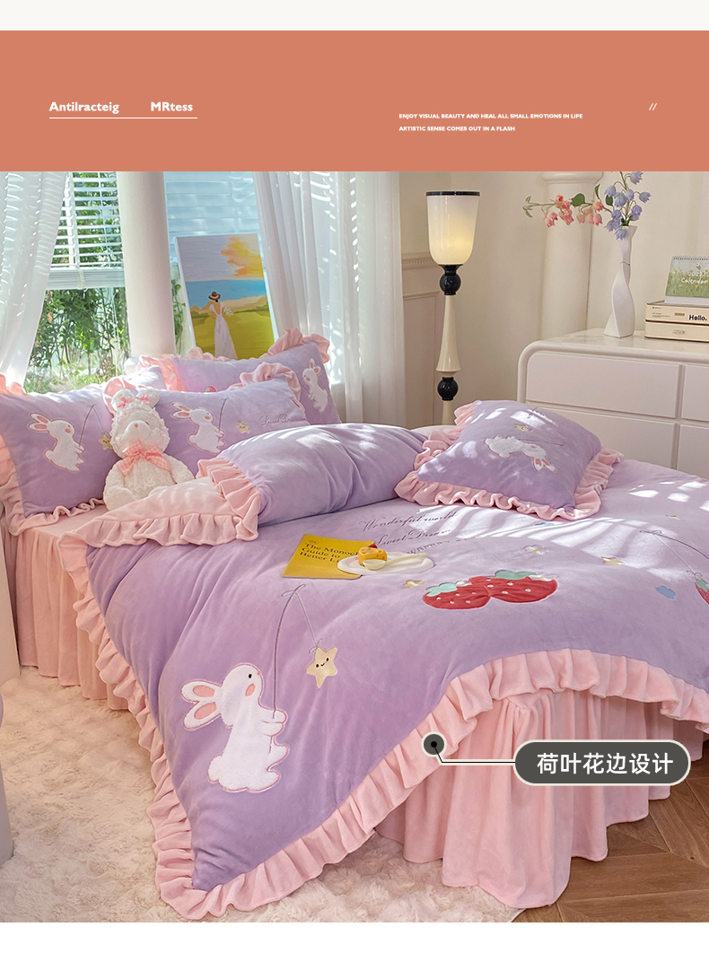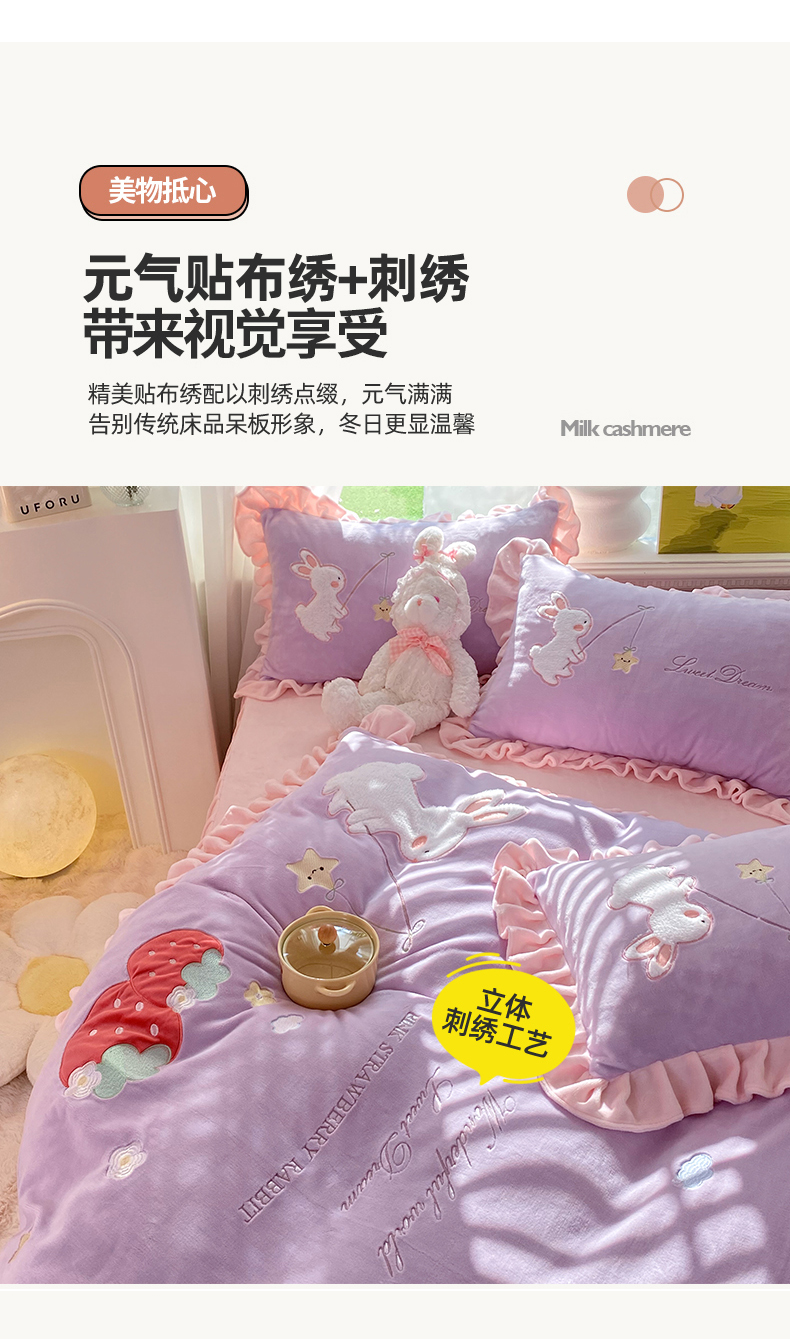 当前位置: 91家纺网 > 商品网购 > 床品套件 > 四件套 > 牛奶绒四件套 > 丝印良品 2023新款牛奶绒摘星兔贴布绣牛奶绒四件套 摘星兔-紫粉