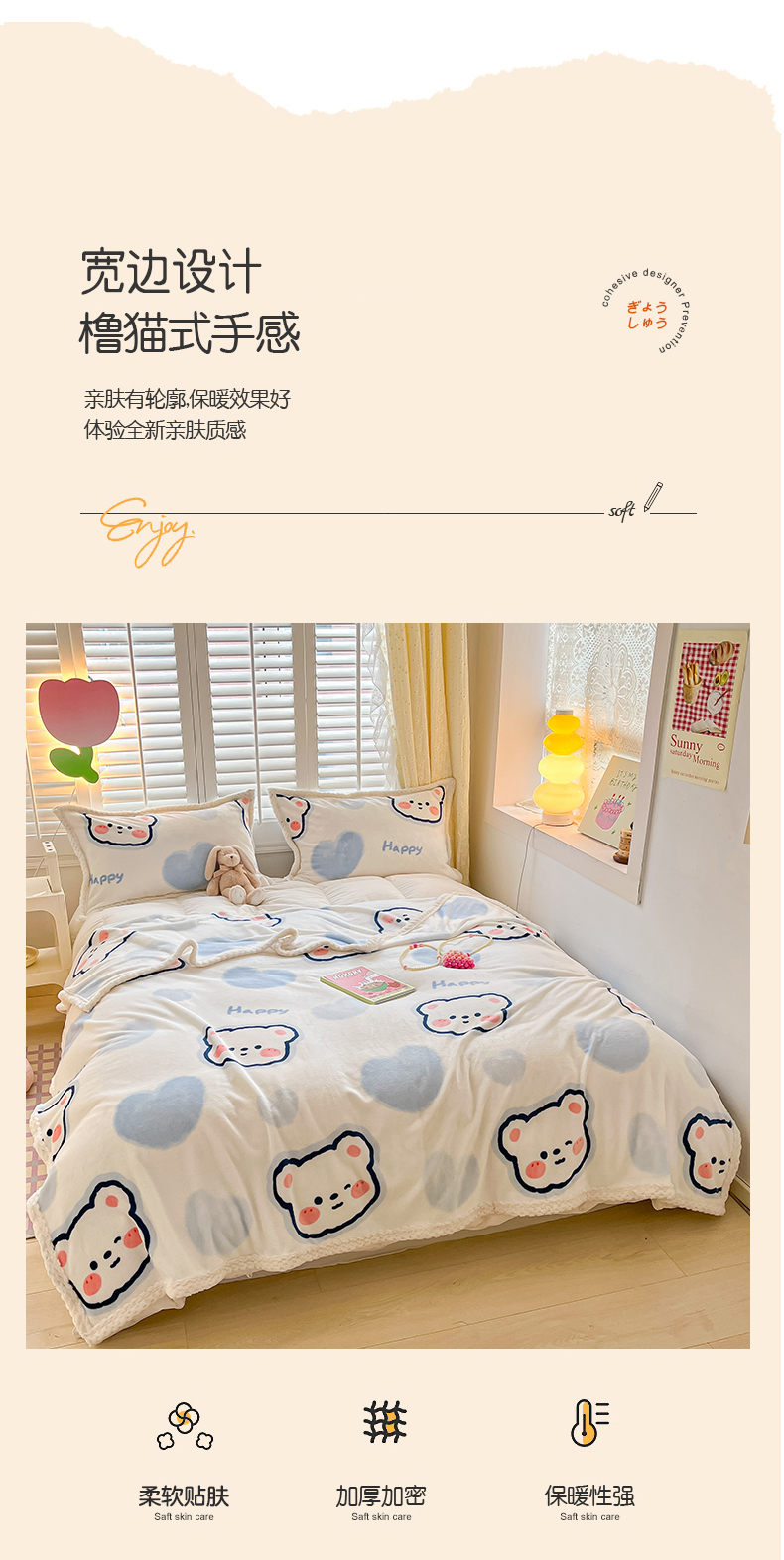川悦生活 2023新款双面240克宽边牛奶绒毯子 毛毯小暖熊