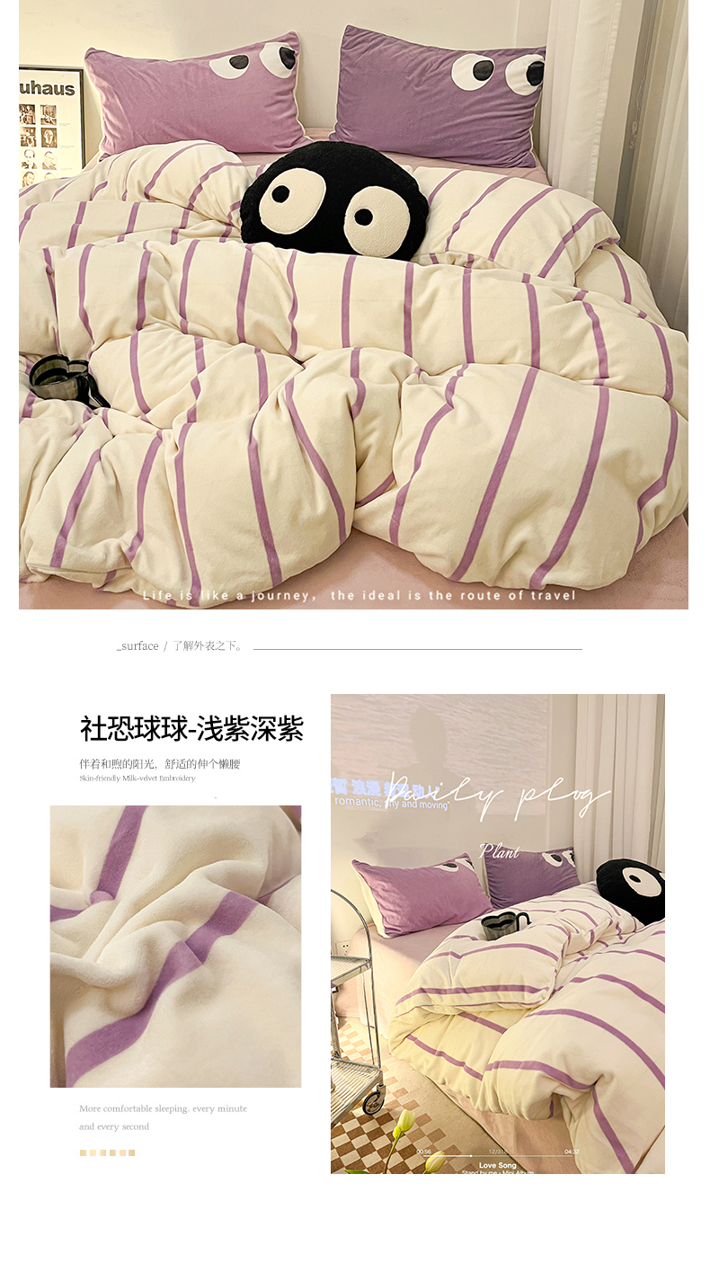 商品名称:川悦生活 2023新款条纹牛奶绒220克四件套 社恐球球-浅紫深紫