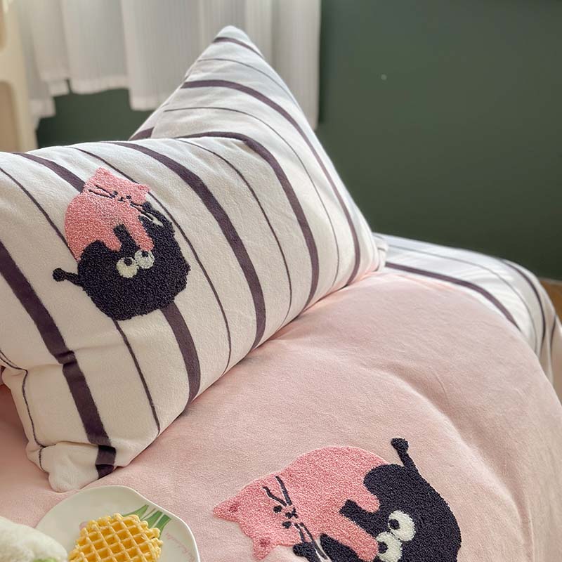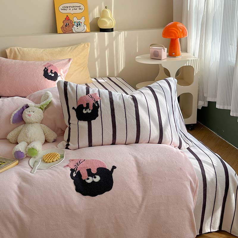 柚子 2023新款高克重牛奶绒多巴胺条纹毛巾绣四件套 小乌黑