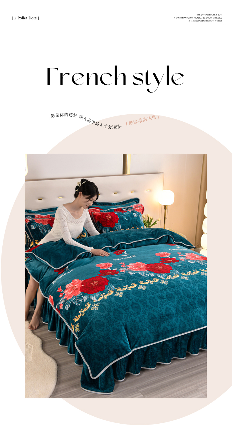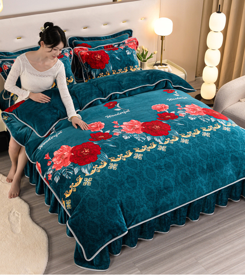 晚静家纺 2024新款8.5斤牛奶绒金貂法莱绒床裙款保暖绒四件套 杏运小花,杏运小花