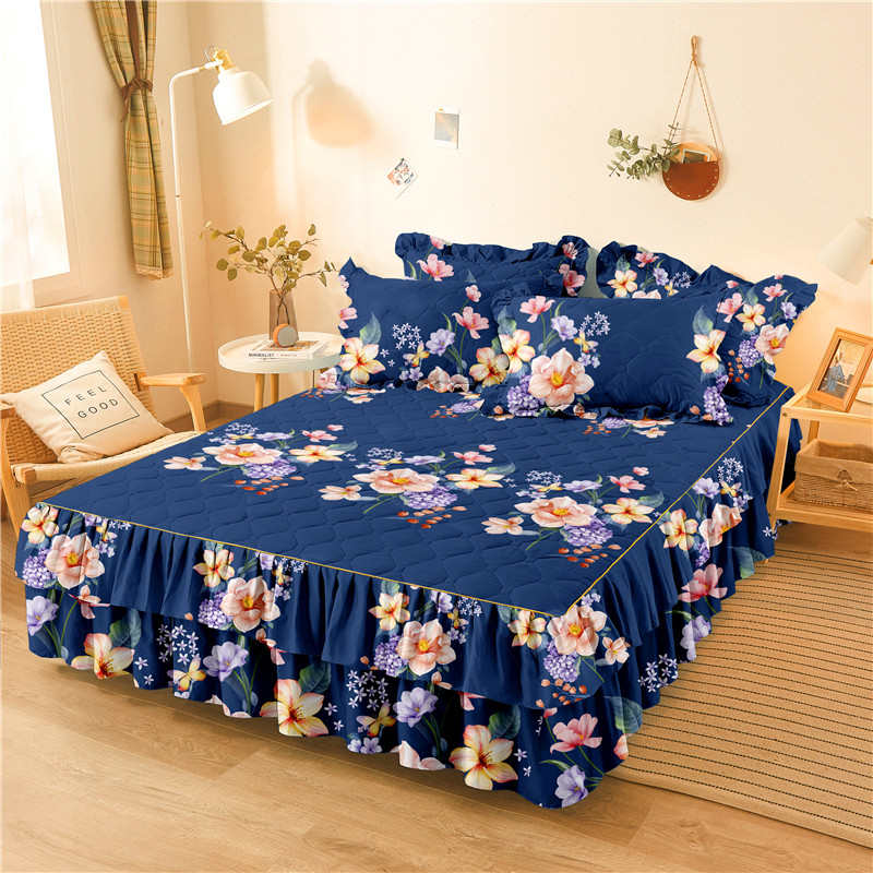 • 91家纺网 家纺一手货源 找家纺 优家居 2023新款芦荟棉双层边夹棉床裙 风采依旧-蓝