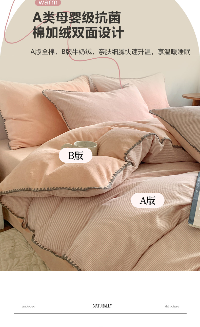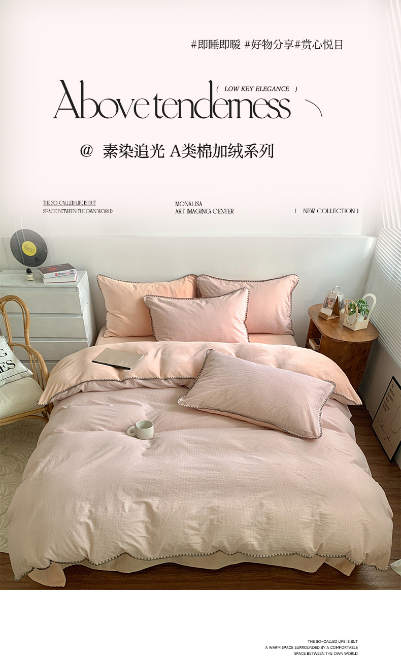 莱茵家居 2023新款AB版加厚款棉加绒四件套 棉加绒条+粉色