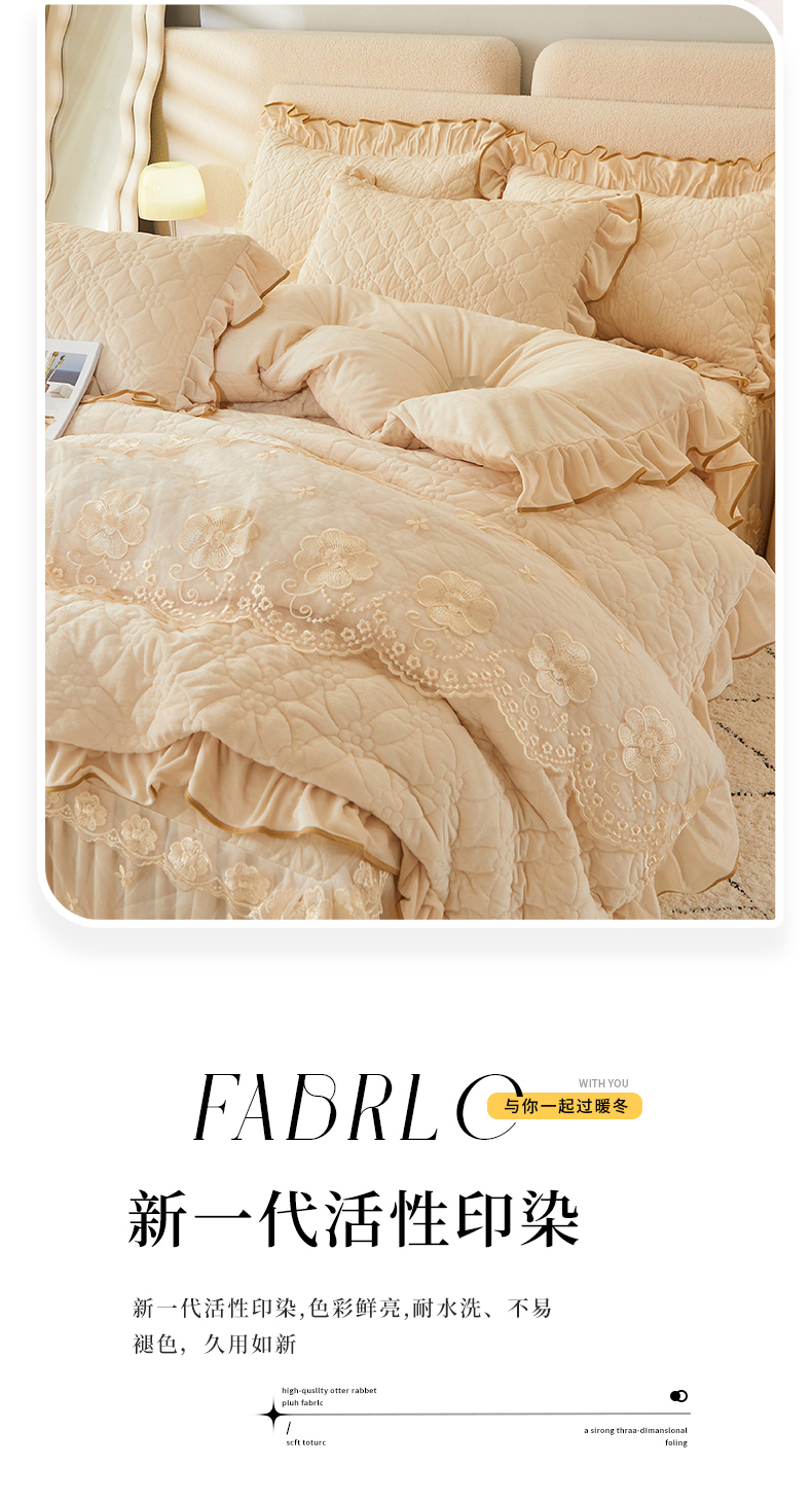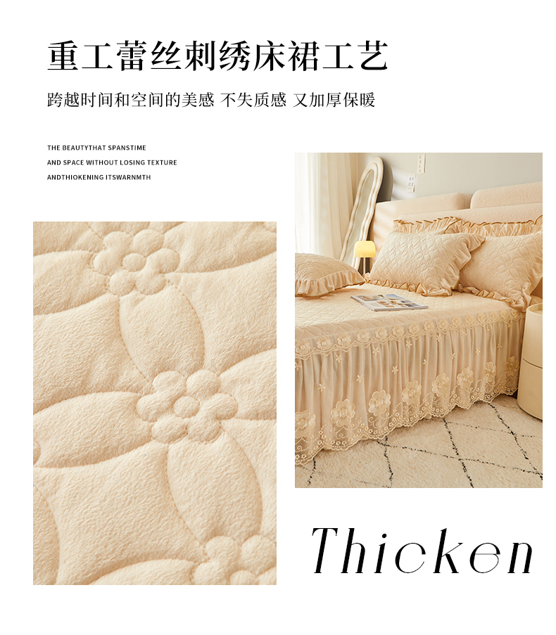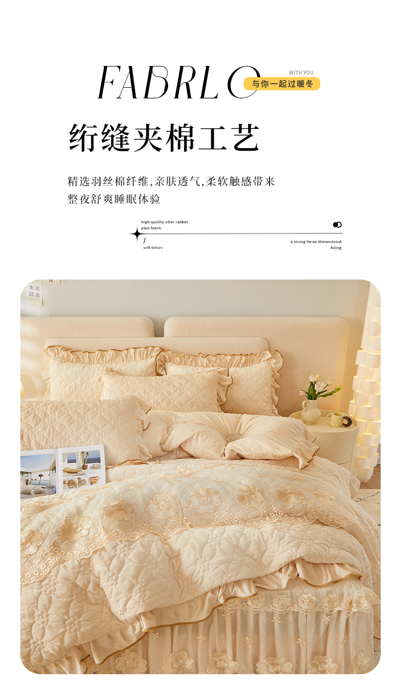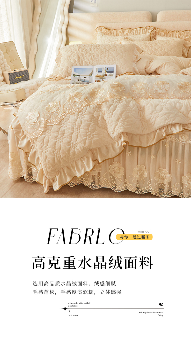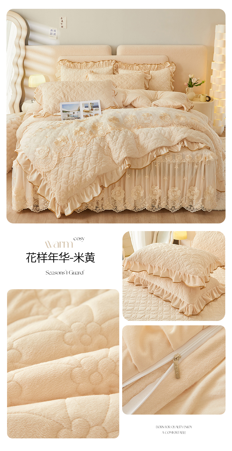 当前位置: 91家纺网 > 商品网购 > 床品套件 > 四件套 > 全棉普通四件套 > 罗艺轩 2024秋冬新款水晶绒花样年华全夹棉加厚床裙四件套 花样年华-米黄