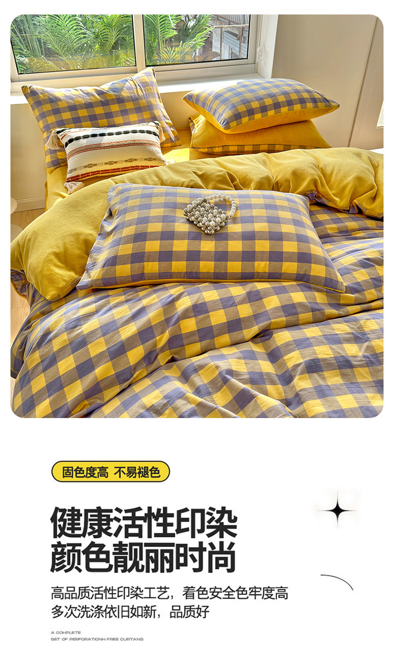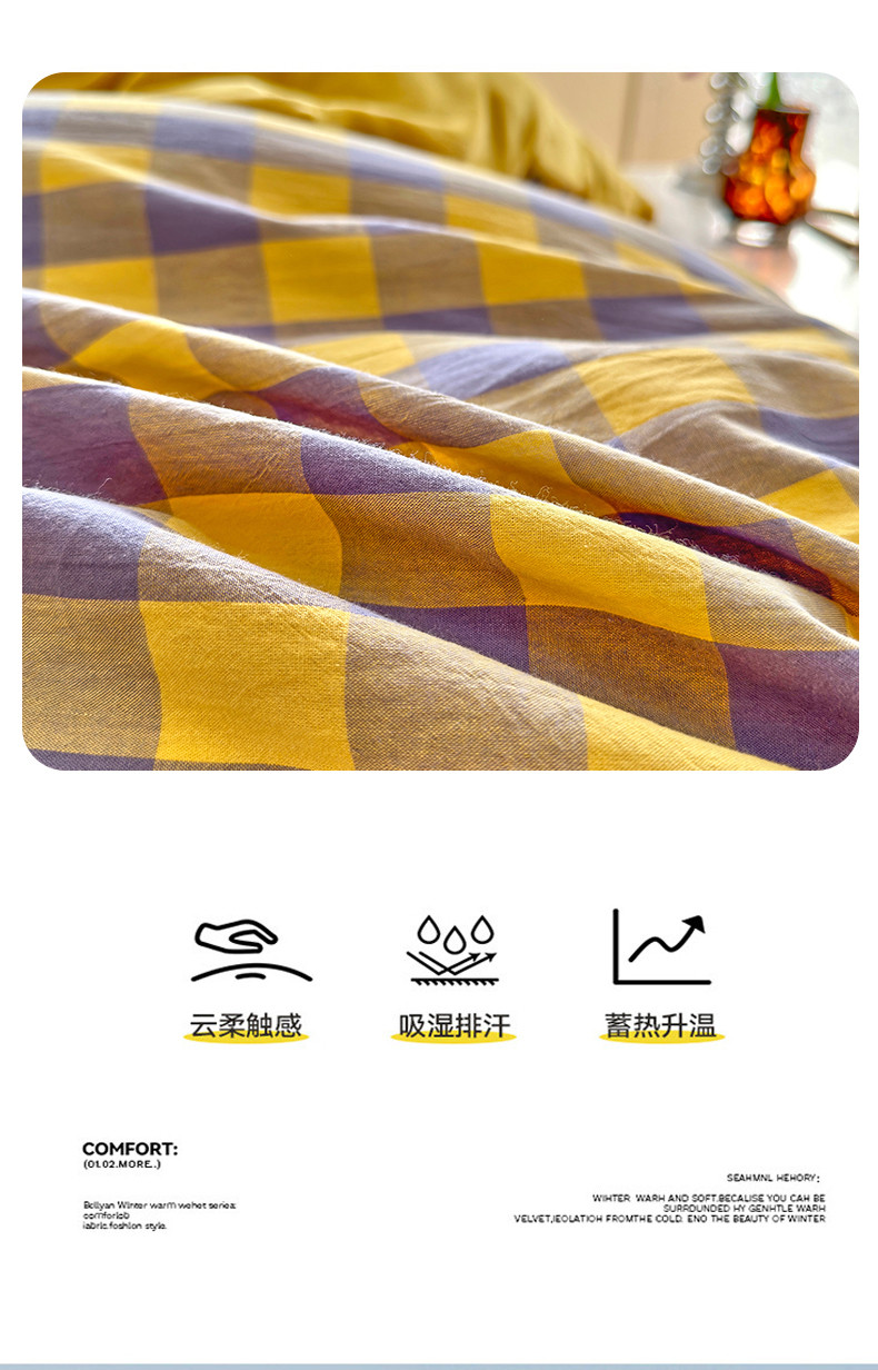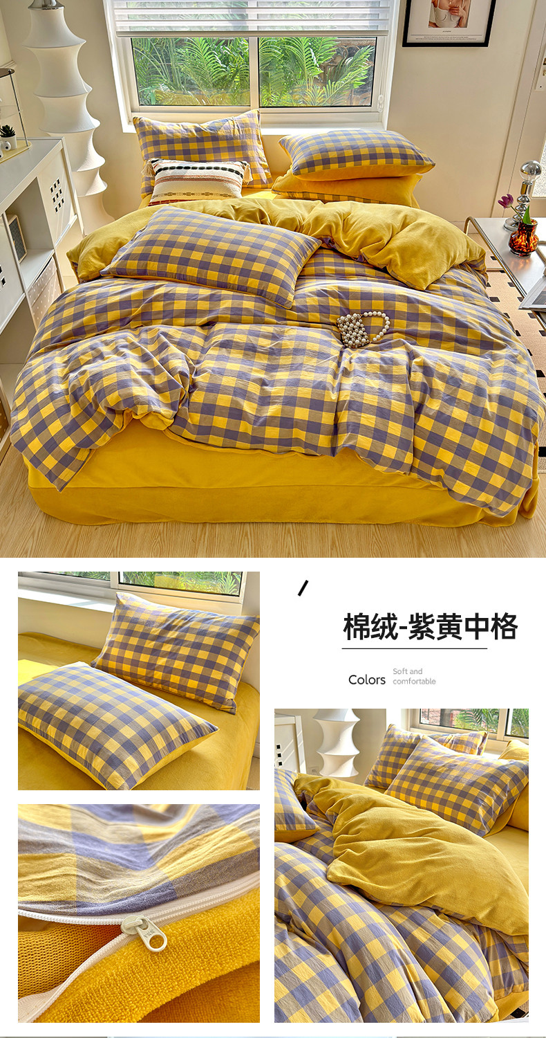 当前位置: 91家纺网 > 商品网购 > 床品套件 > 四件套 > 牛奶绒四件套 > 三沁 2023新款全棉水洗棉加绒四件套 棉绒-紫黄中格