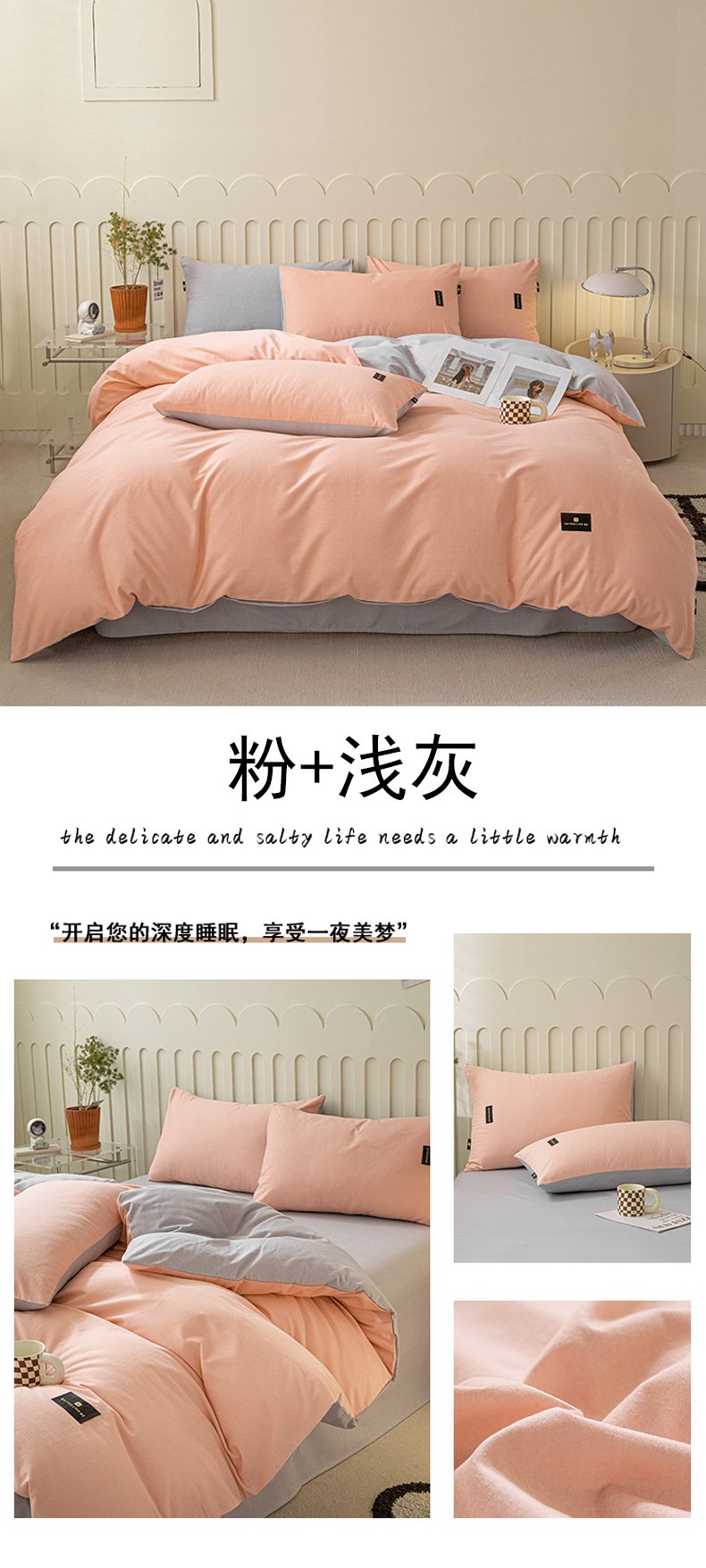 当前位置: 91家纺网 > 商品网购 > 床品套件 > 四件套 > 磨毛活性四件套 > 涵宸家纺 棉磨毛-纯色织标-四件套(含单品) 粉+浅灰