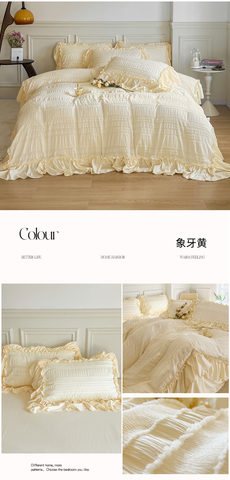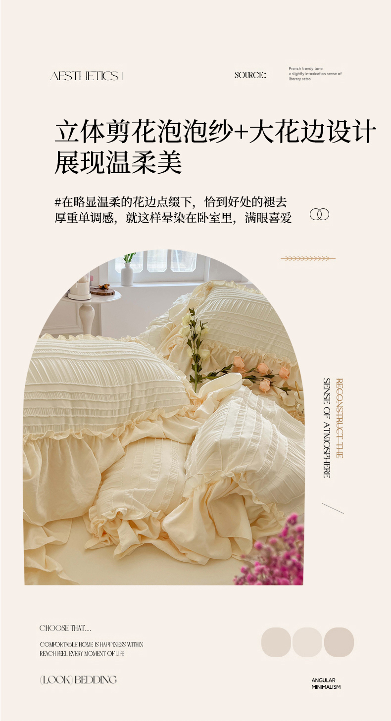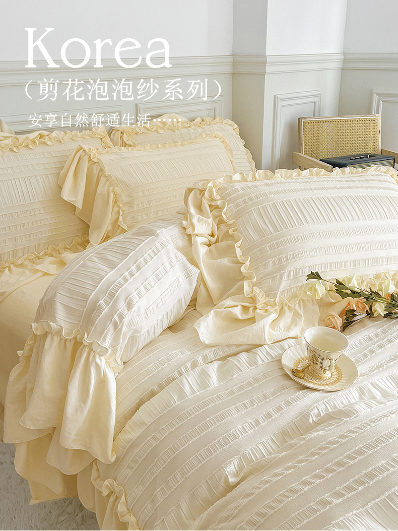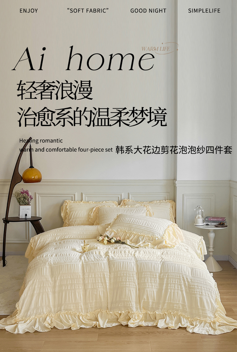 顾里家纺 2024新款韩系大花边泡泡纱套件 象牙黄