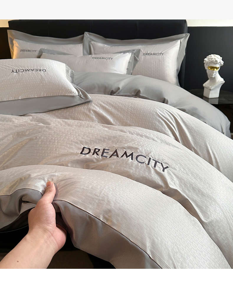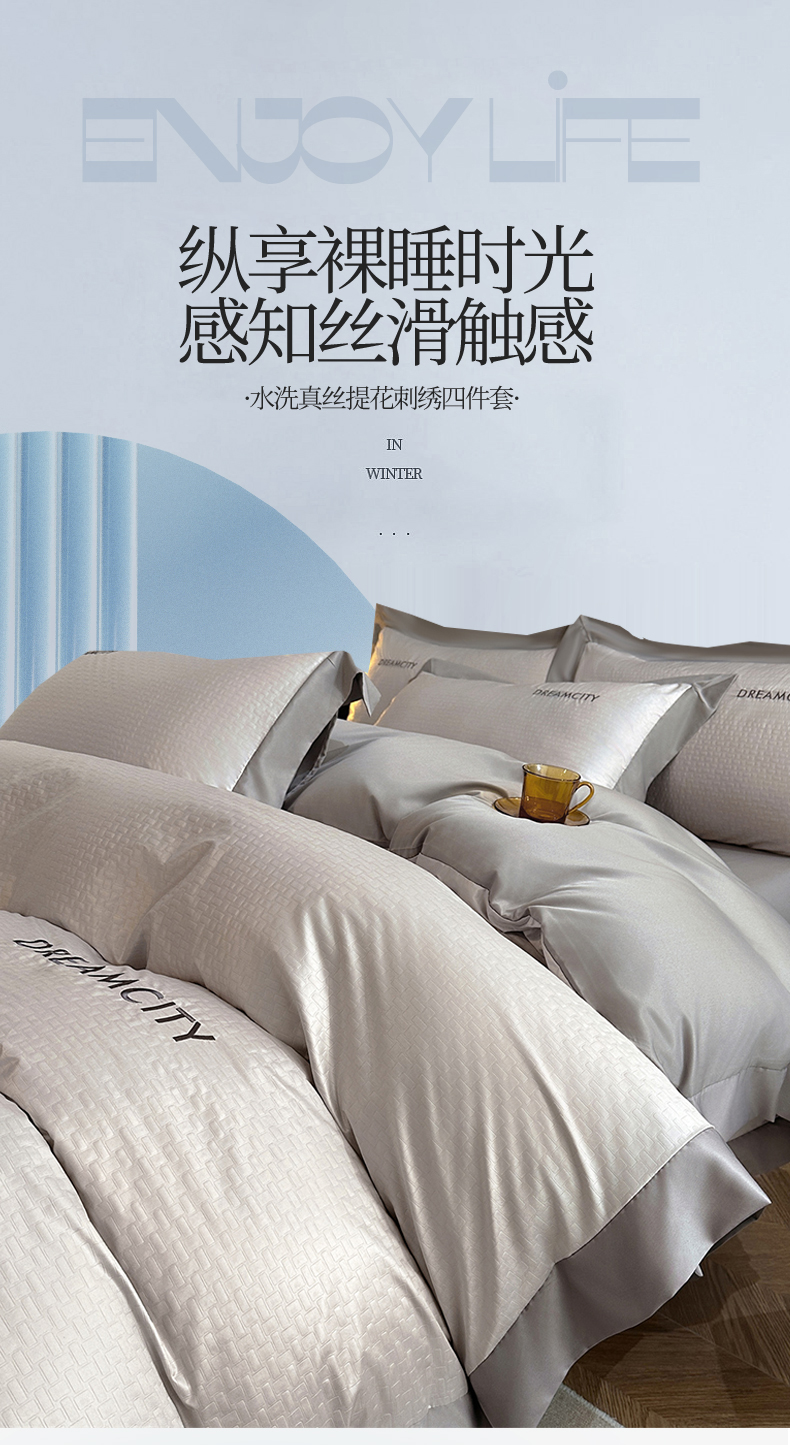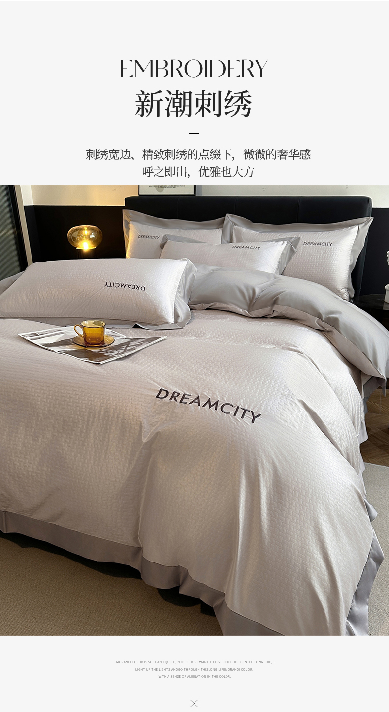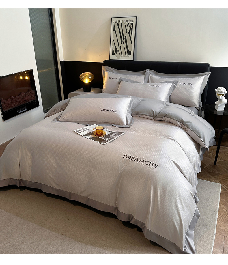 (总)古吉梦 2024新款水洗真丝提花四件套--迪梦 ,宾利蓝+山灰,豆沙+山灰,高级灰+奶茶,海青+山灰,奶昔白+奶茶,山灰+中灰,天空蓝+海青,星空蓝+山灰,中灰+山灰
