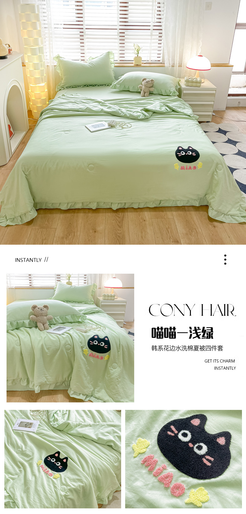 商品名称:宜家坊2024新款韩系花边ins风水洗棉夏被四件套 喵喵-水绿