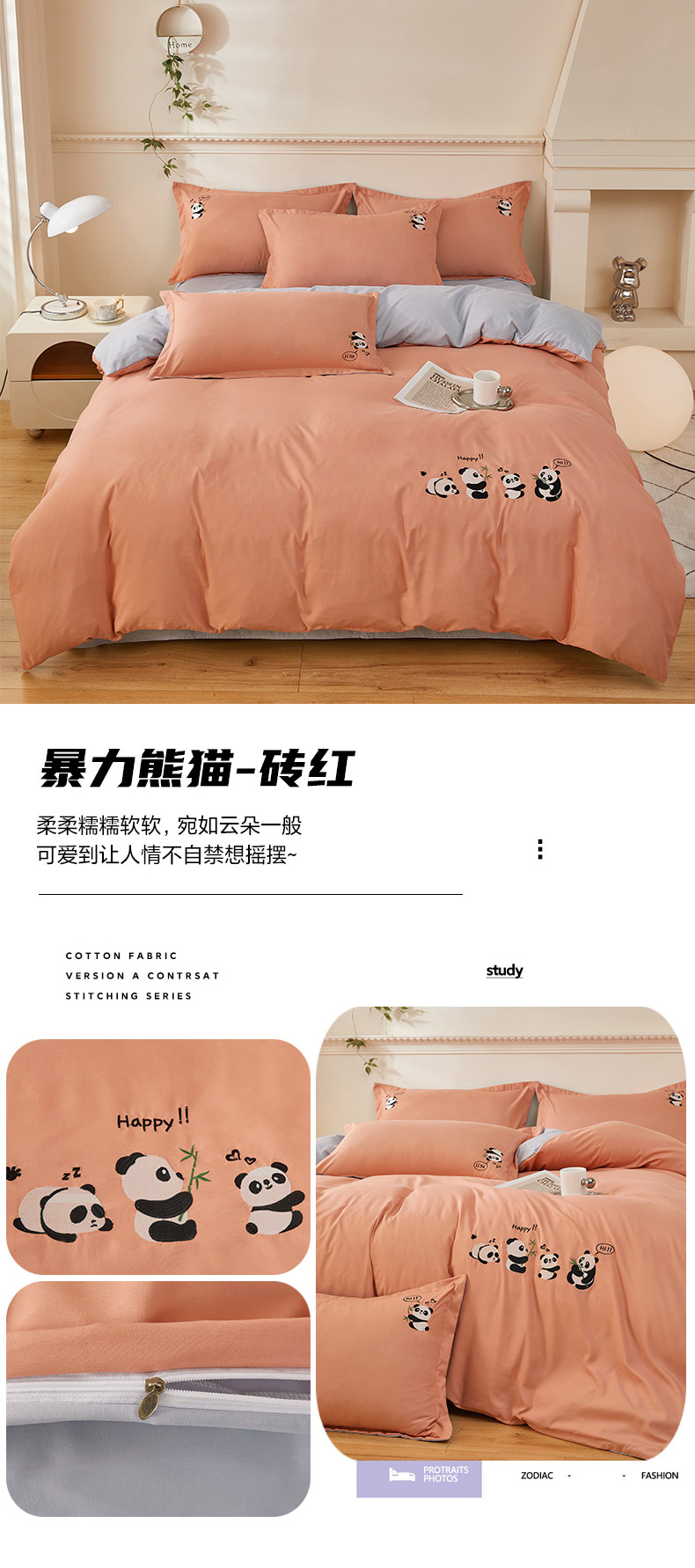 商品名称:佳宇轩 2024新款水洗棉四件套磨毛四件套绣花四件套纯色四件套 暴力熊猫-砖红