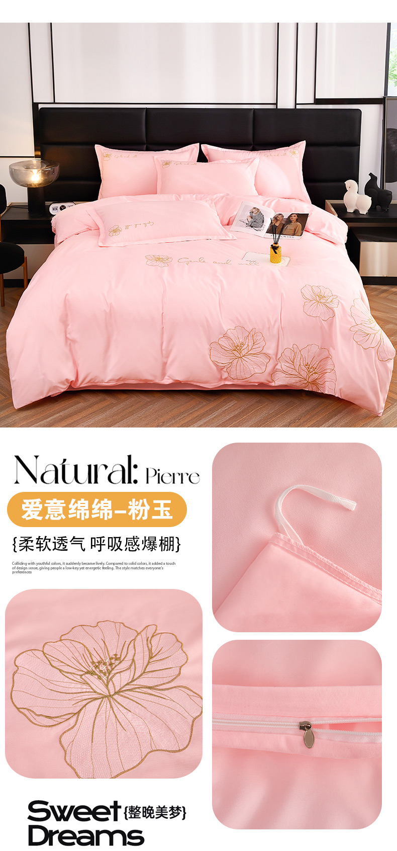 商品名称:佳宇轩 2024新款水洗棉四件套磨毛四件套绣花四件套纯色四件套 爱意绵绵-粉玉