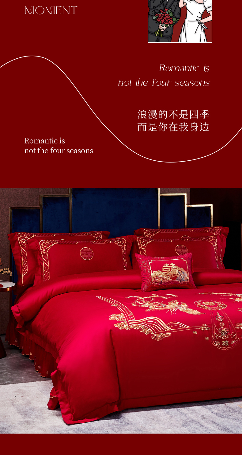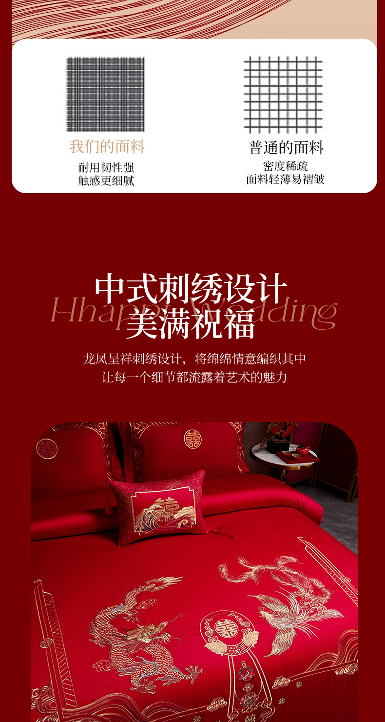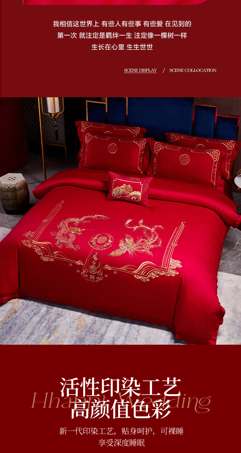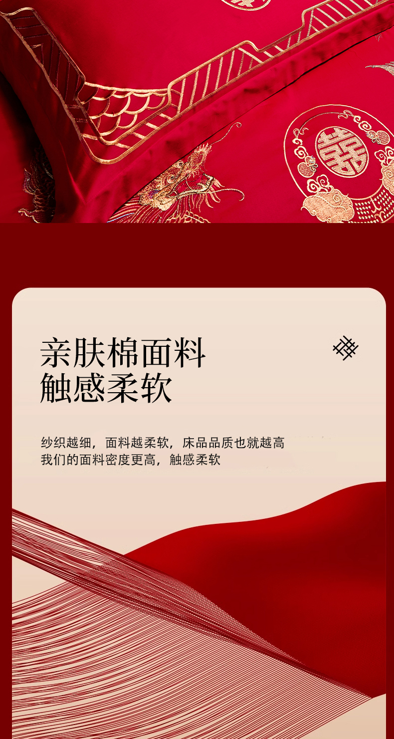 当前位置: 91家纺网 > 商品网购 > 床品套件 > 四件套 > 婚庆四件套 > 晶缦家纺 2024新款亲肤舒适棉刺绣花婚庆四件套系列 龙凤祥和-悦-绣花花边床单款