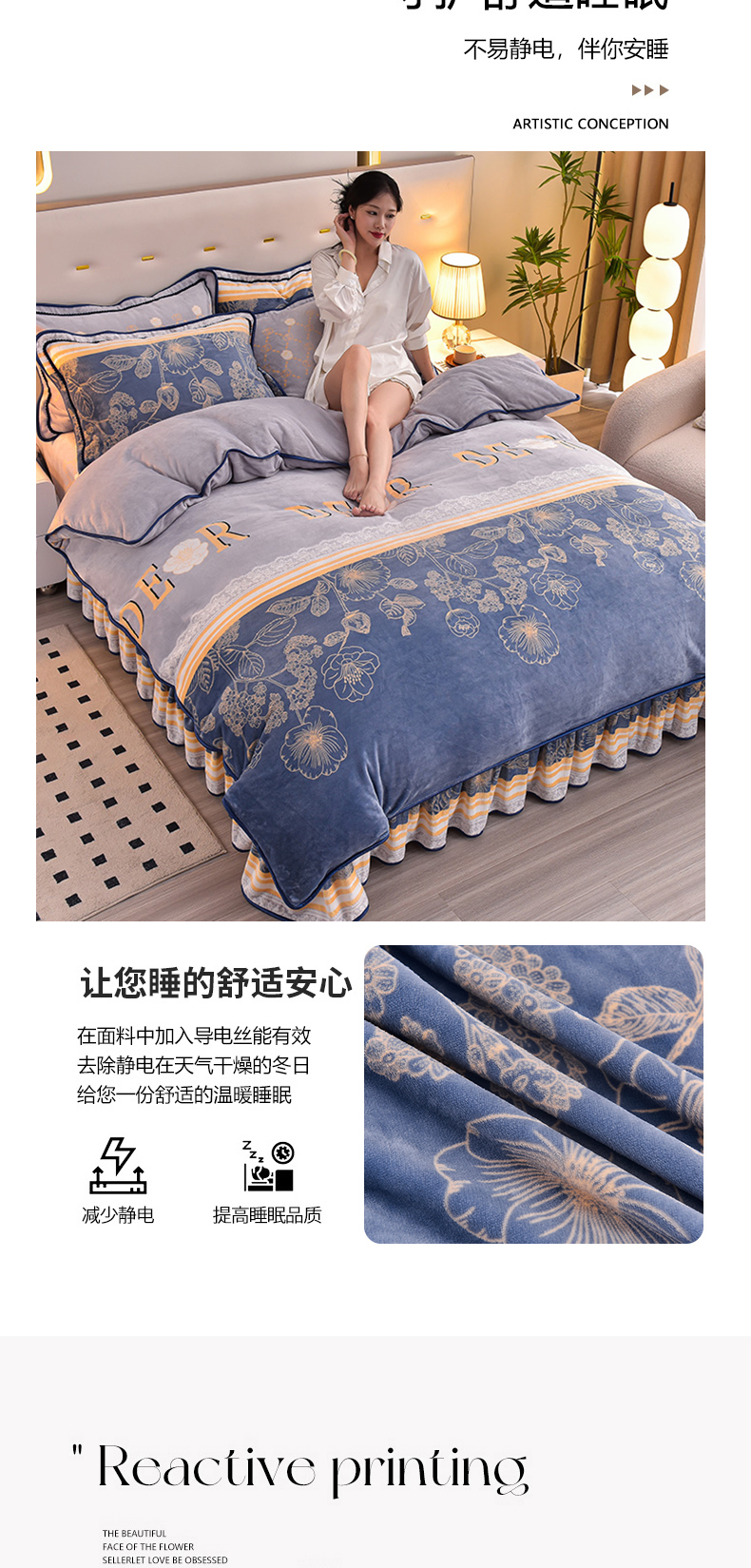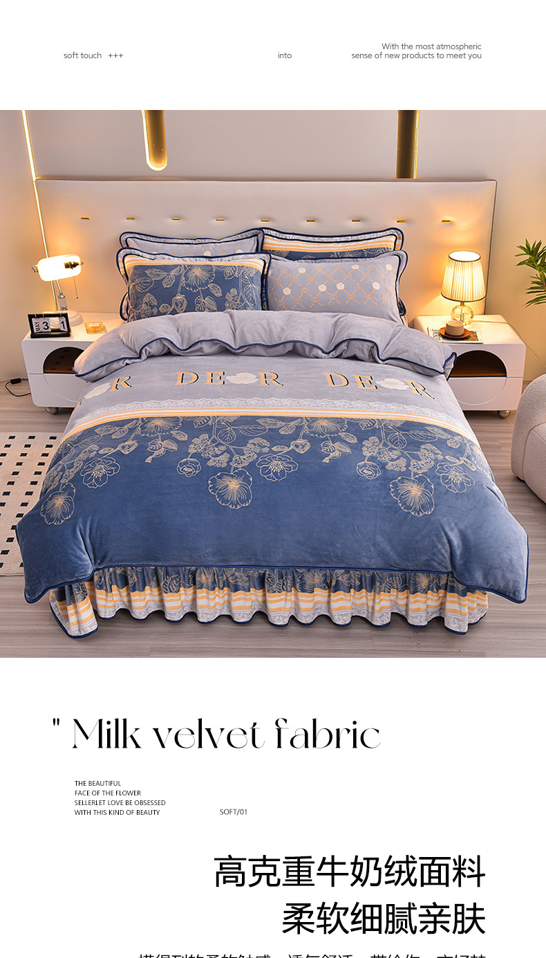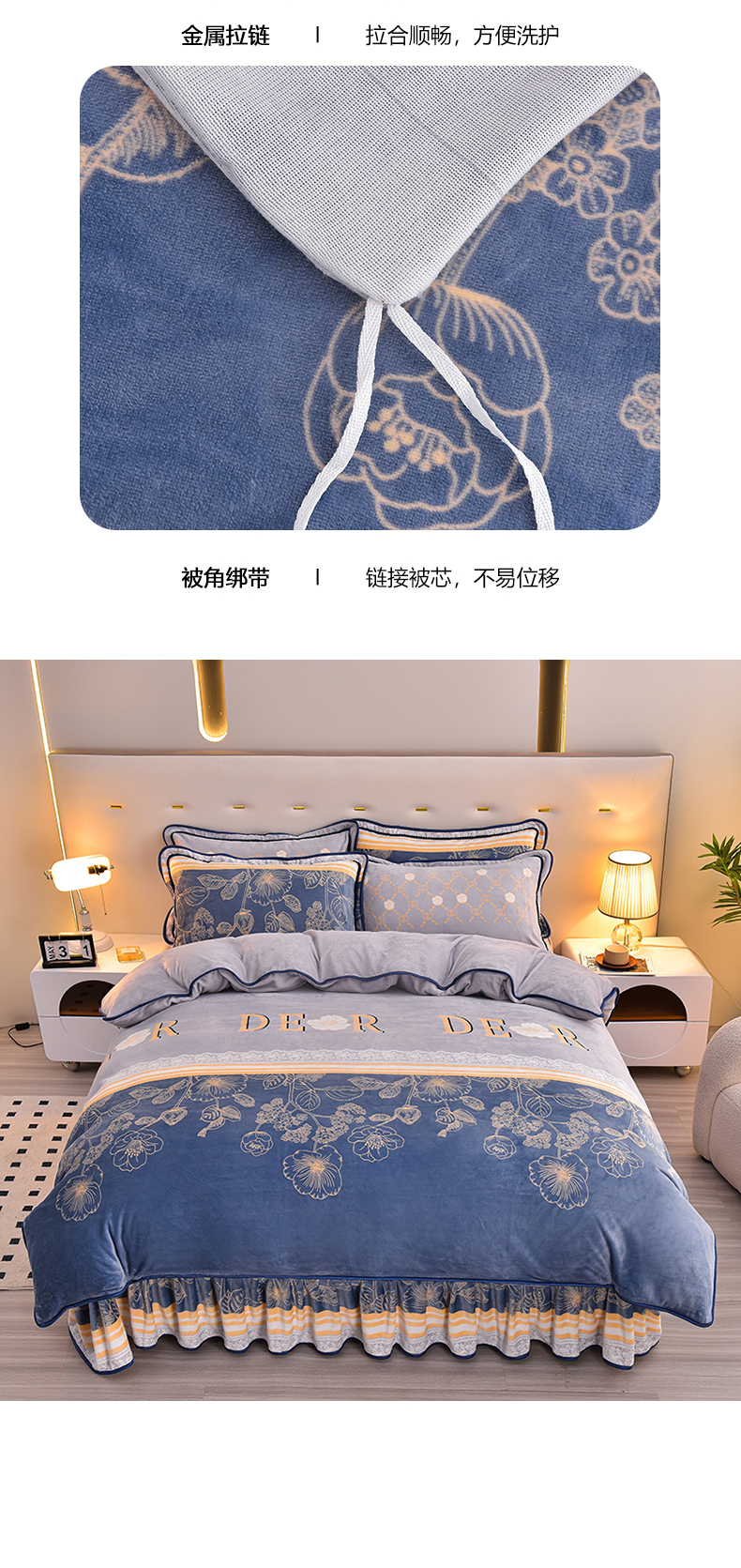 商品名称:亿品2025直播爆款9.5斤牛奶绒四件套加厚保暖床裙四件套 爱在花期《蓝》