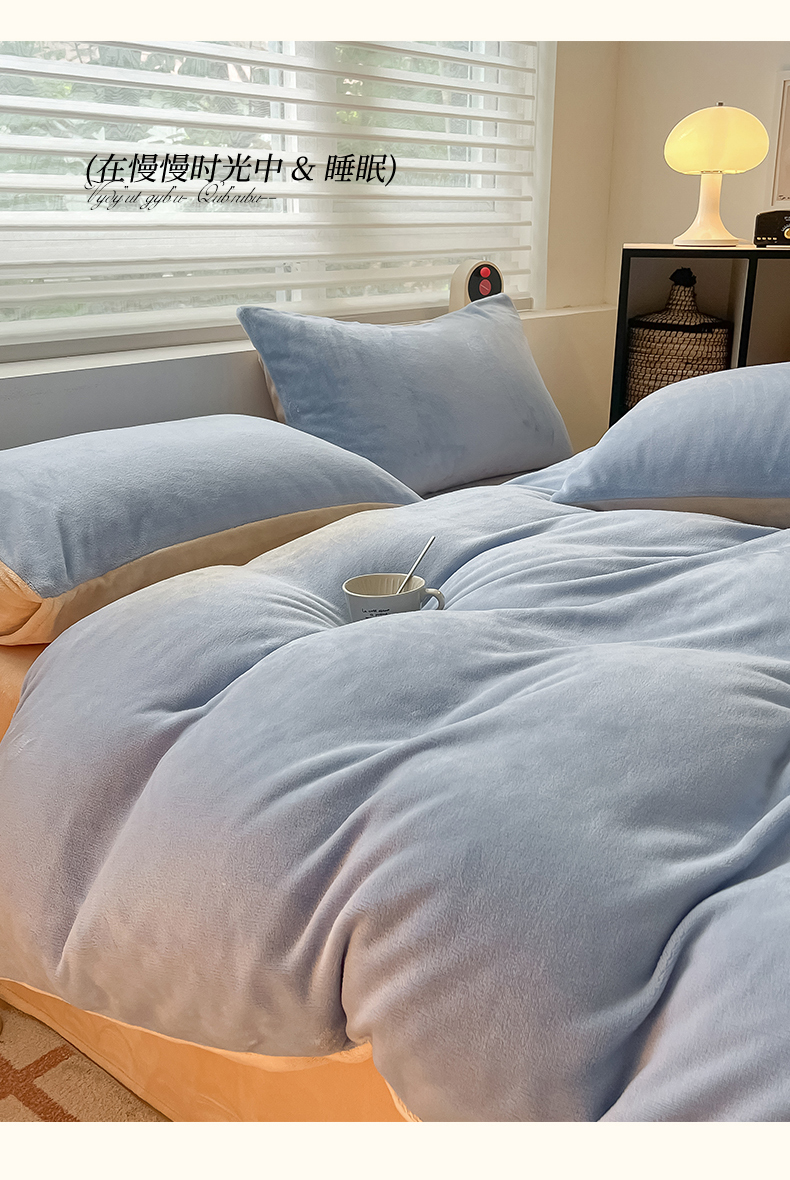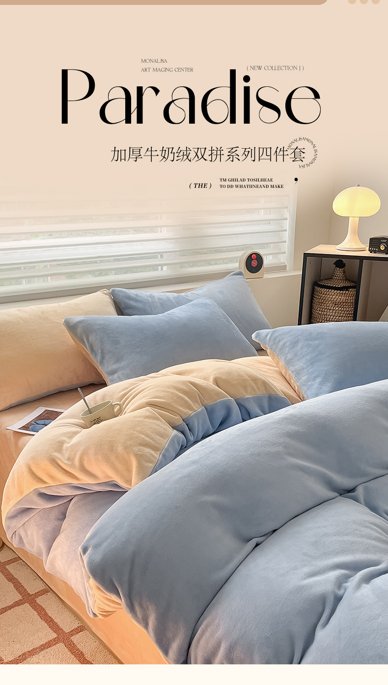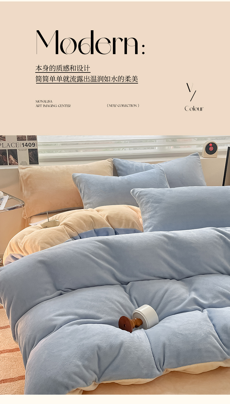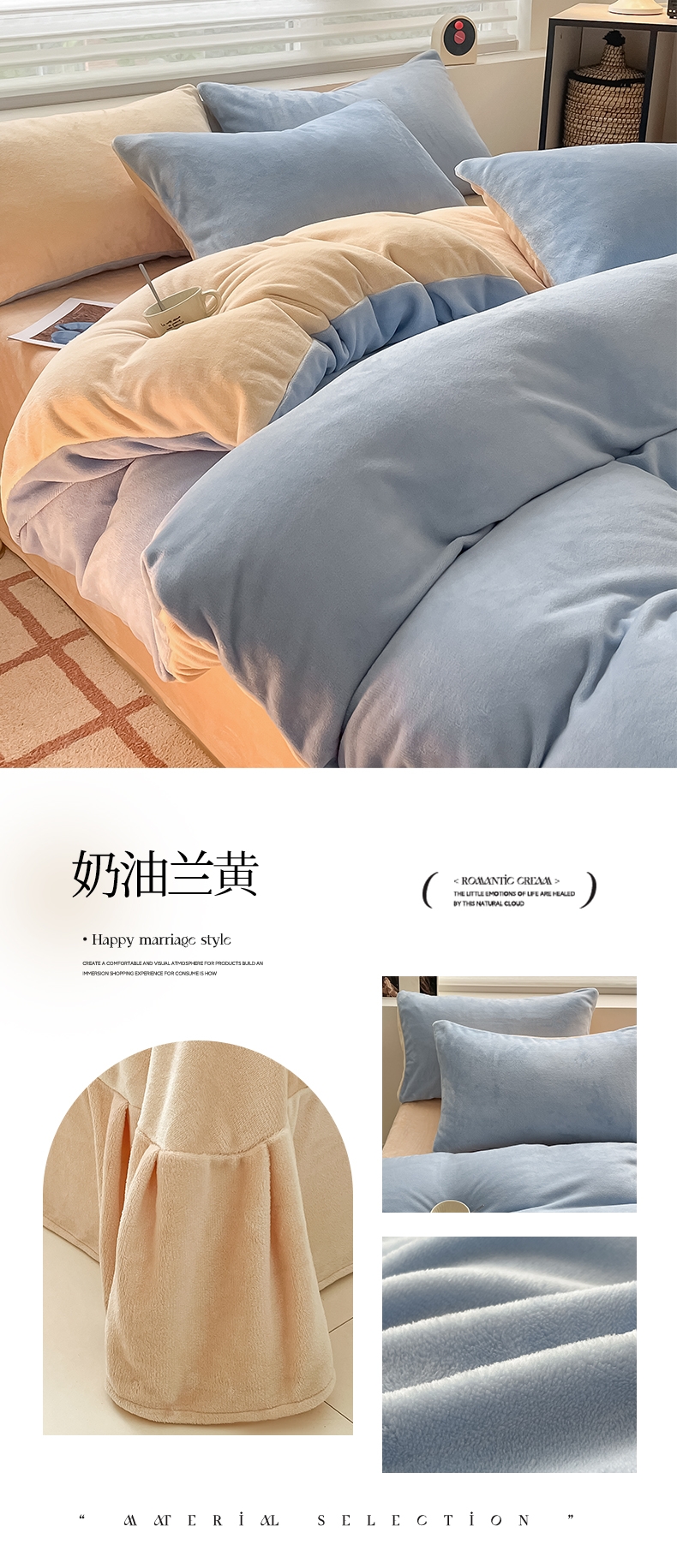 商品名称:绘萱 2025新款高克重纯色双拼牛奶绒四件套 奶油蓝黄