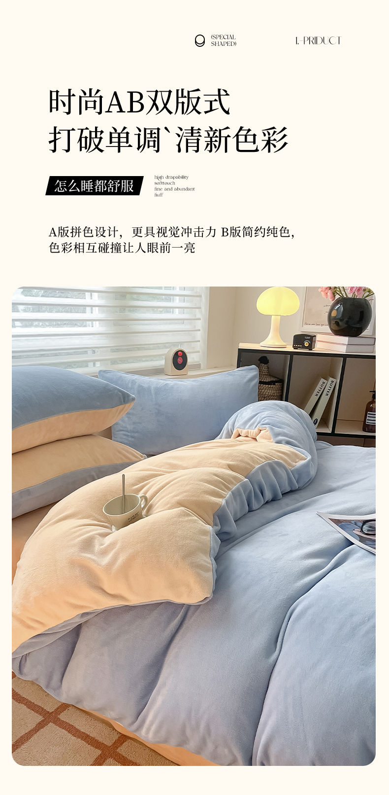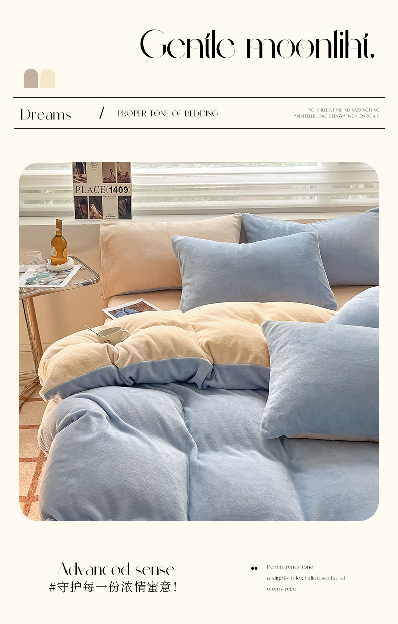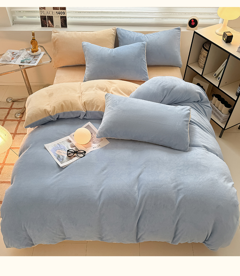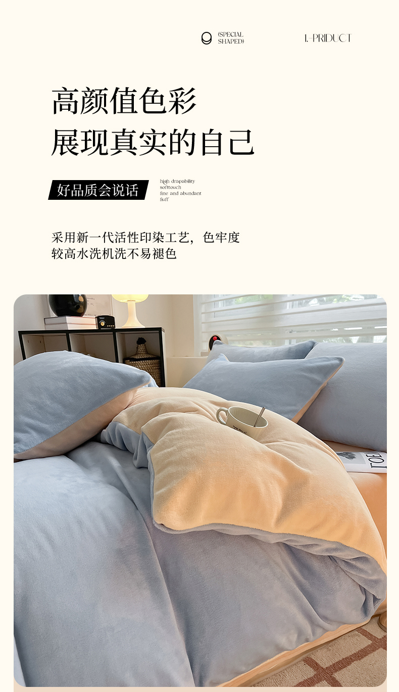 商品名称:绘萱 2025新款高克重纯色双拼牛奶绒四件套 奶油蓝黄
