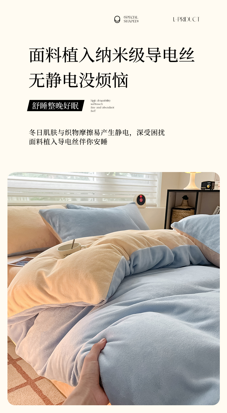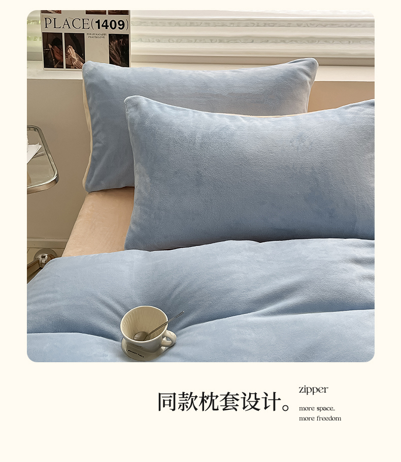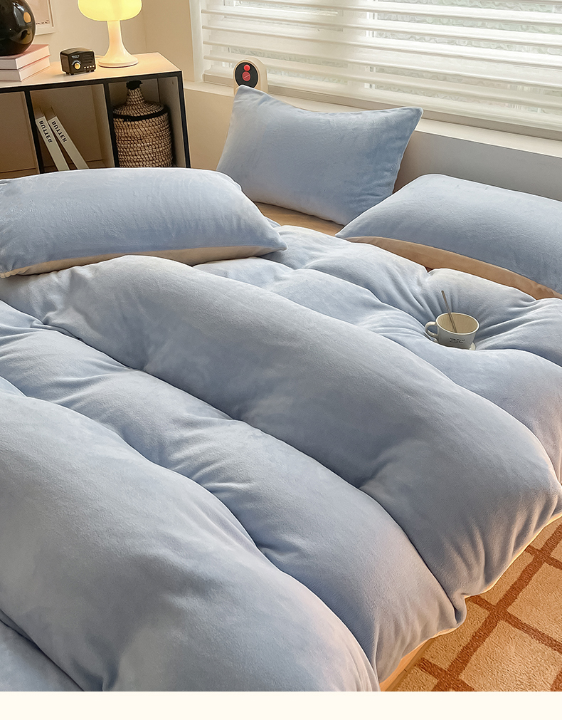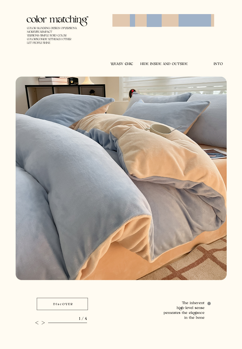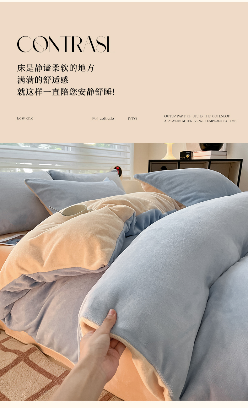 商品名称:绘萱 2025新款高克重纯色双拼牛奶绒四件套 奶油蓝黄