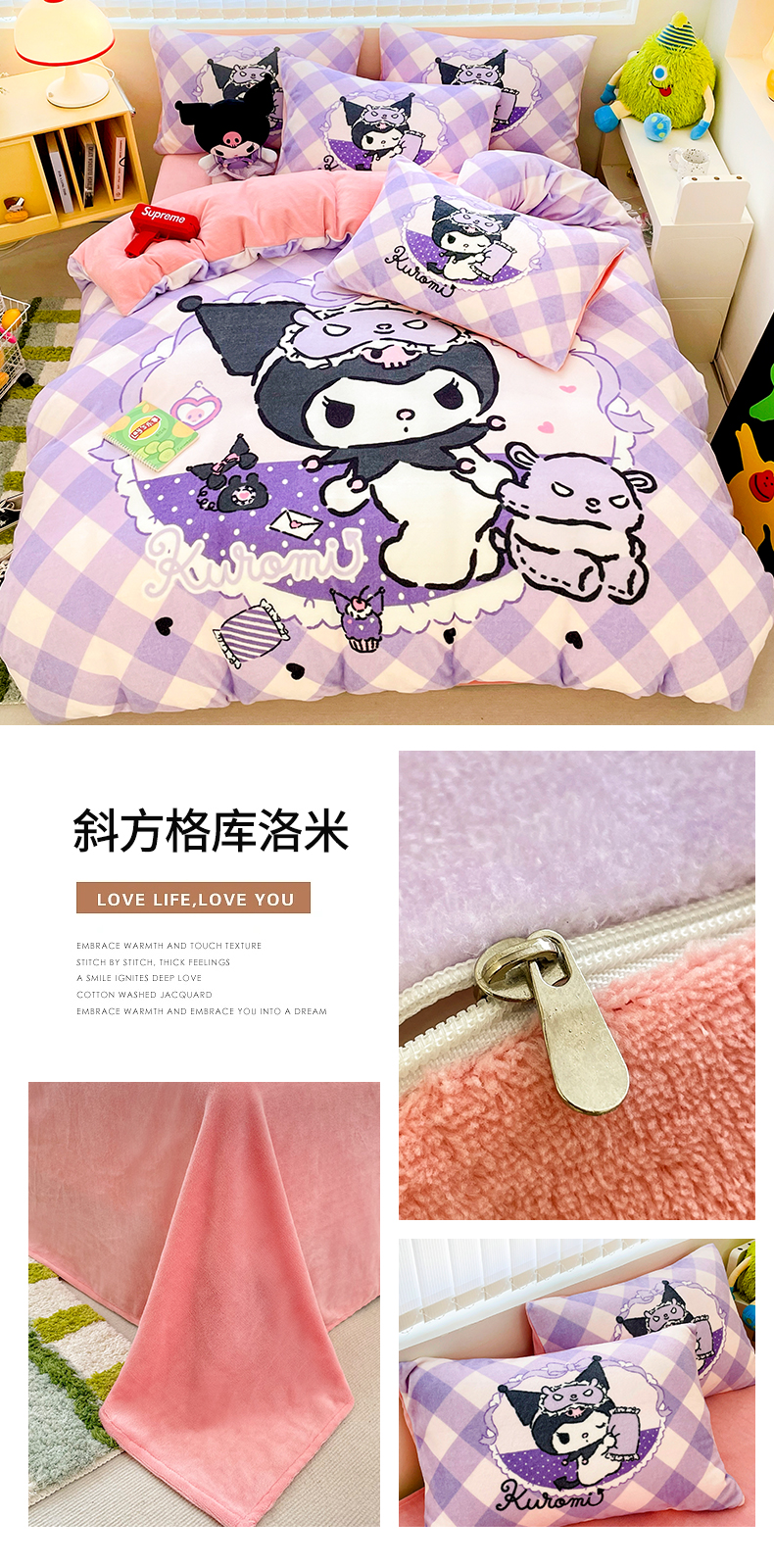商品名称:米帛家纺 2024新款正版授权大版三丽鸥牛奶绒四件套 斜方格库洛米
