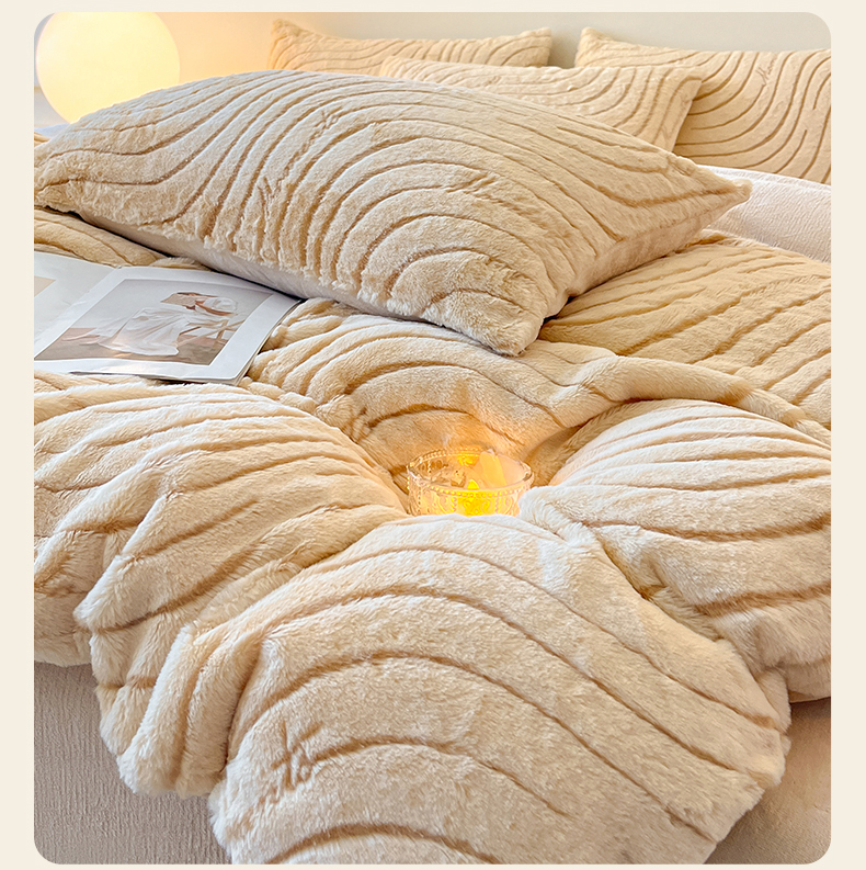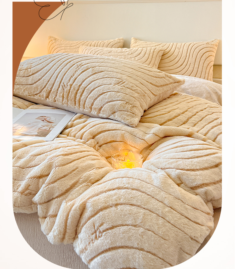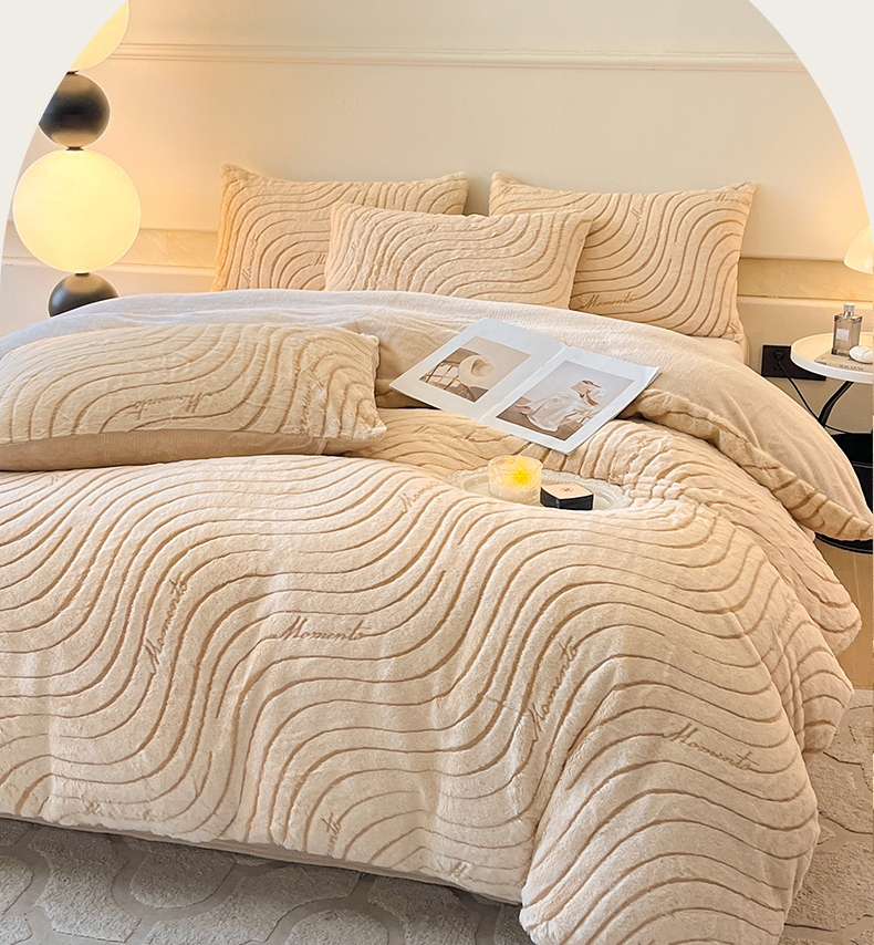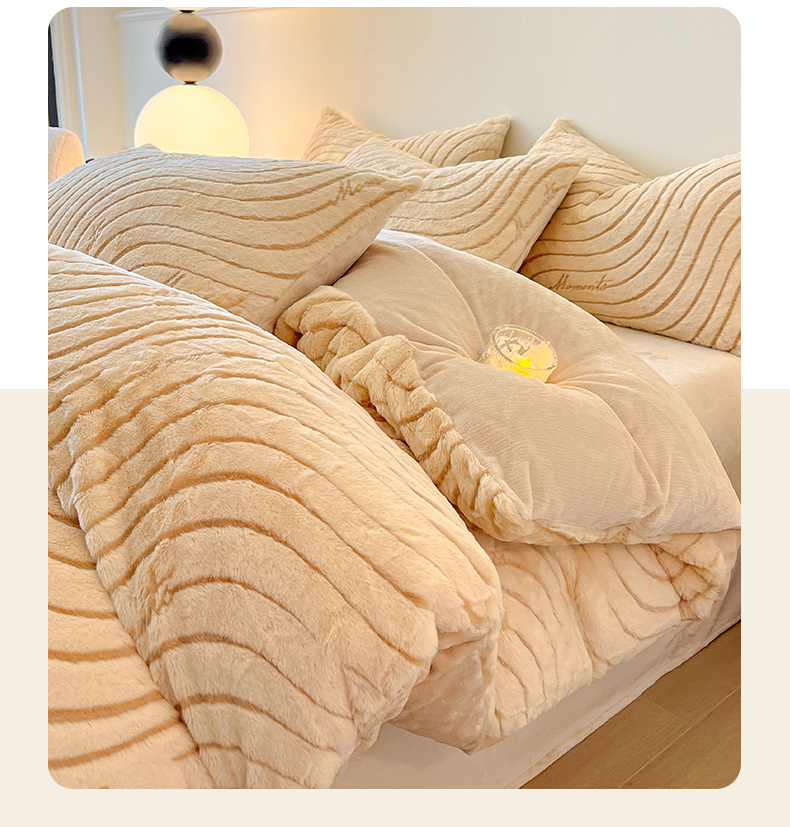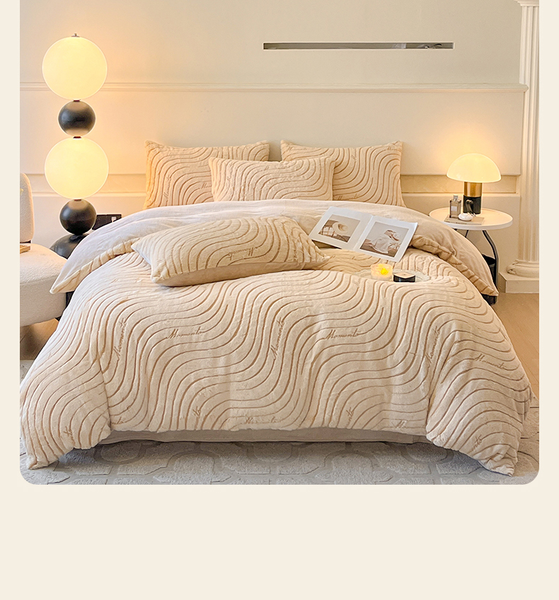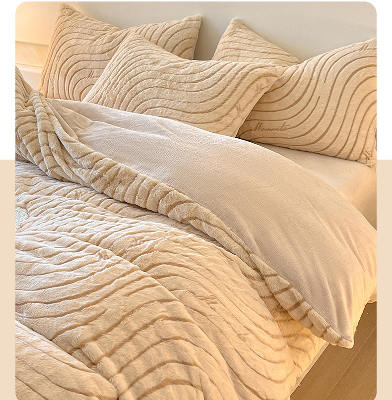 2024新款高克重着色烂花兔毛绒牛奶绒四件套宝宝绒婴儿绒秋冬加厚法莱绒法兰绒珊瑚绒三件套 波浪-奶茶咖