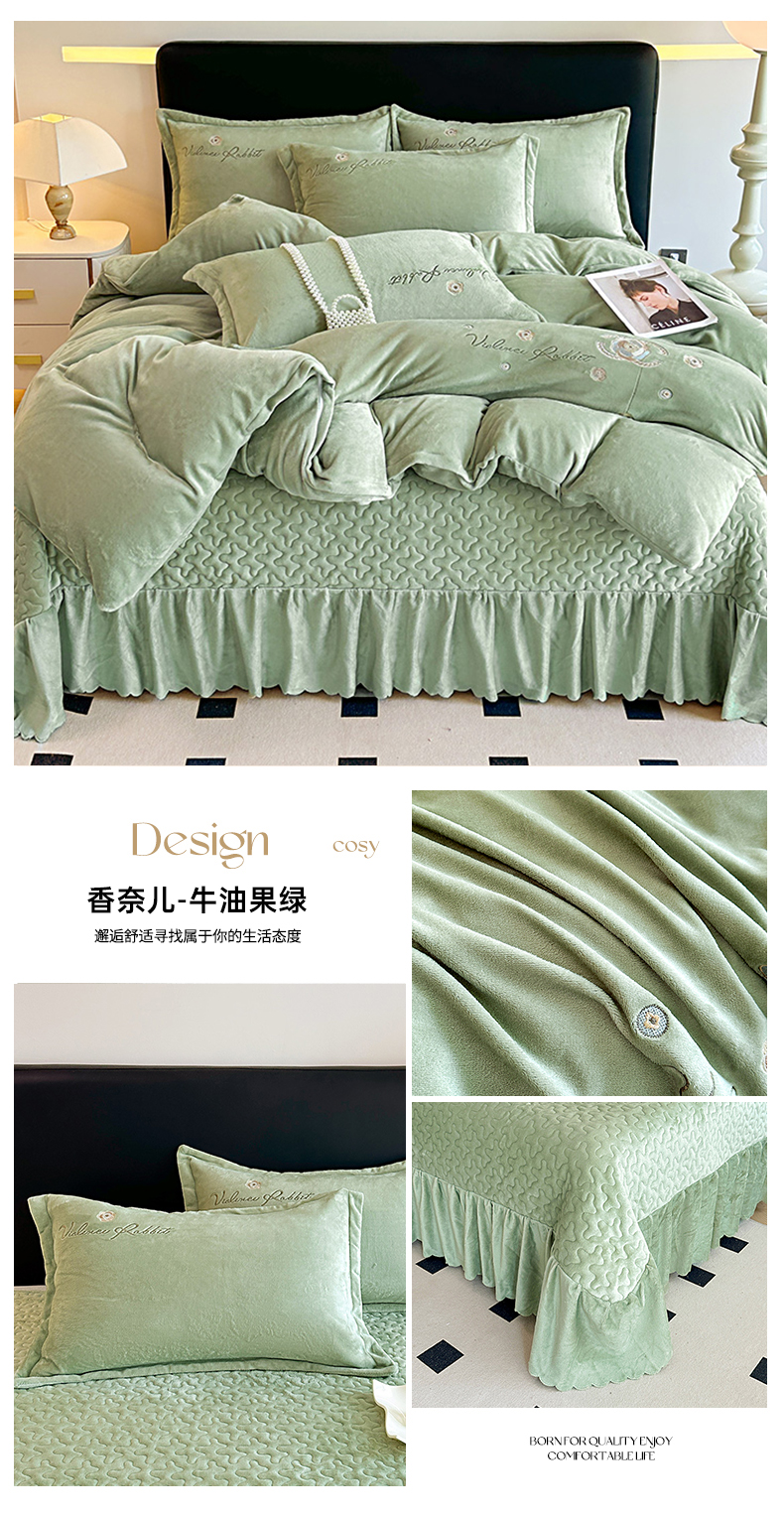 陌乘坊家纺 2024新款牛奶绒床盖款四件套-香奈 香奈-牛油果绿