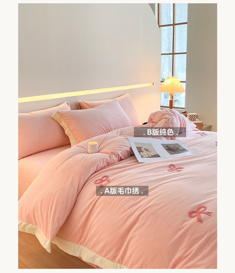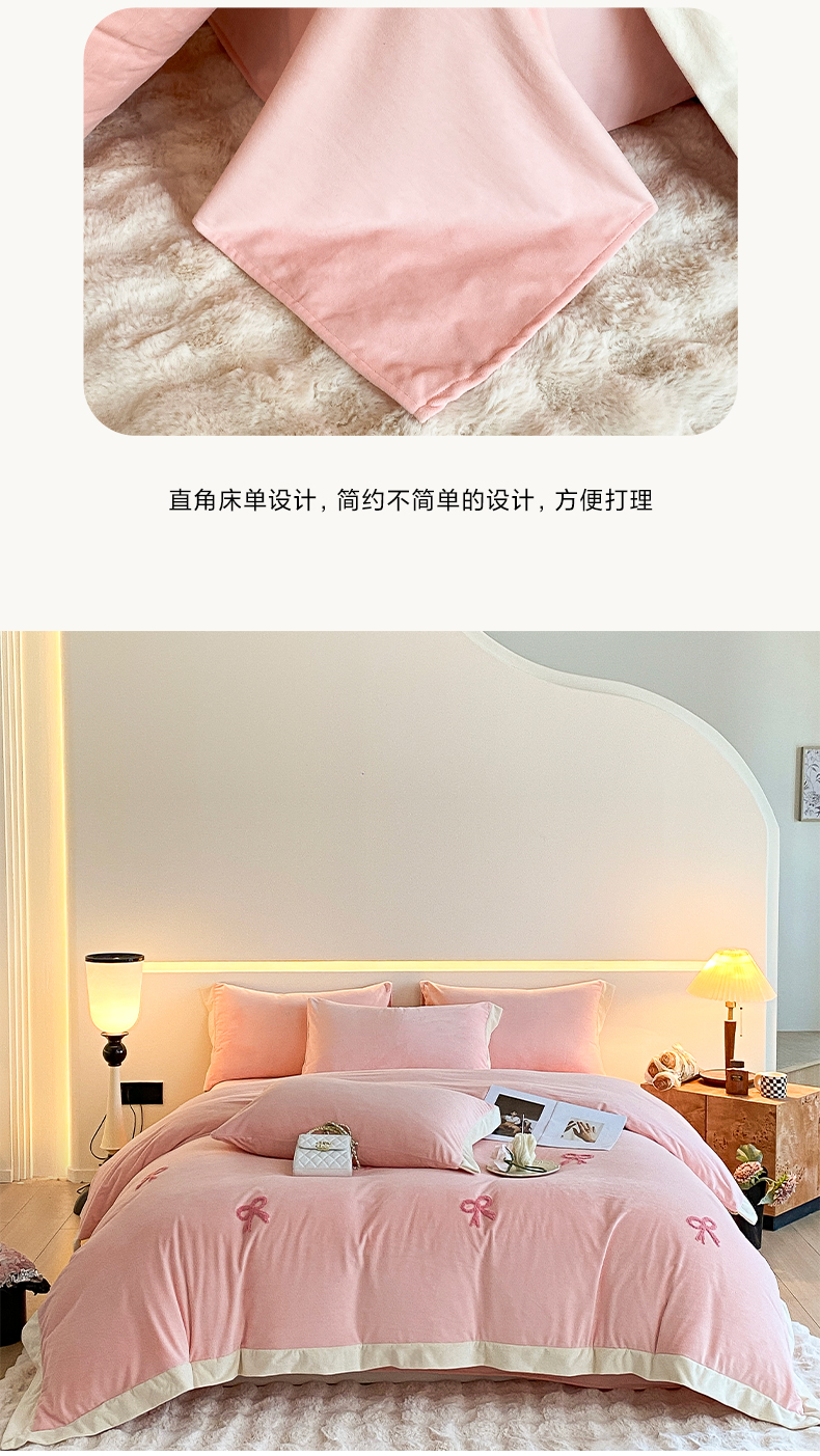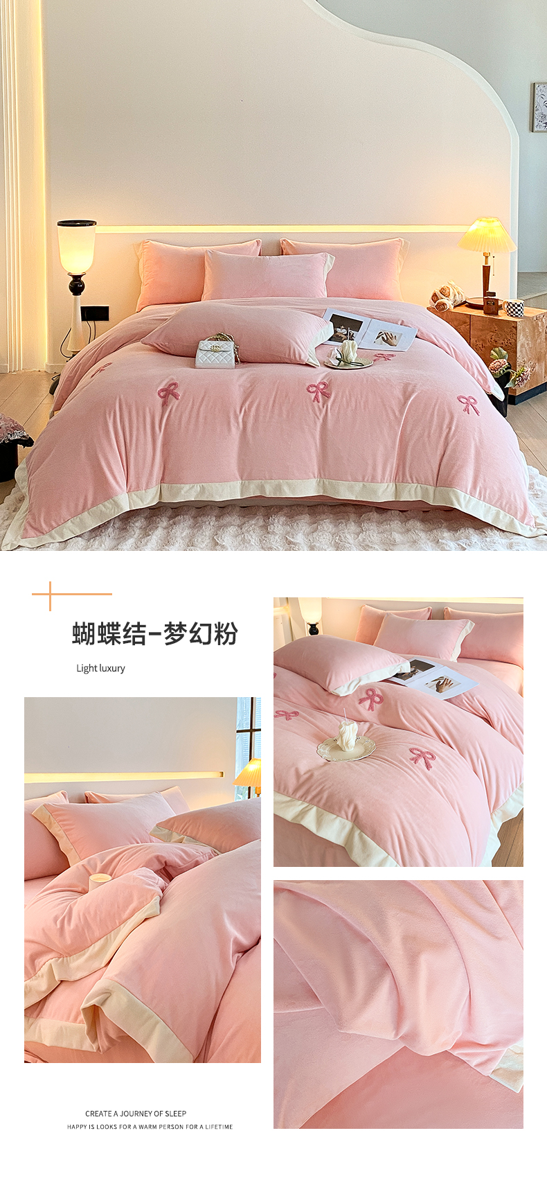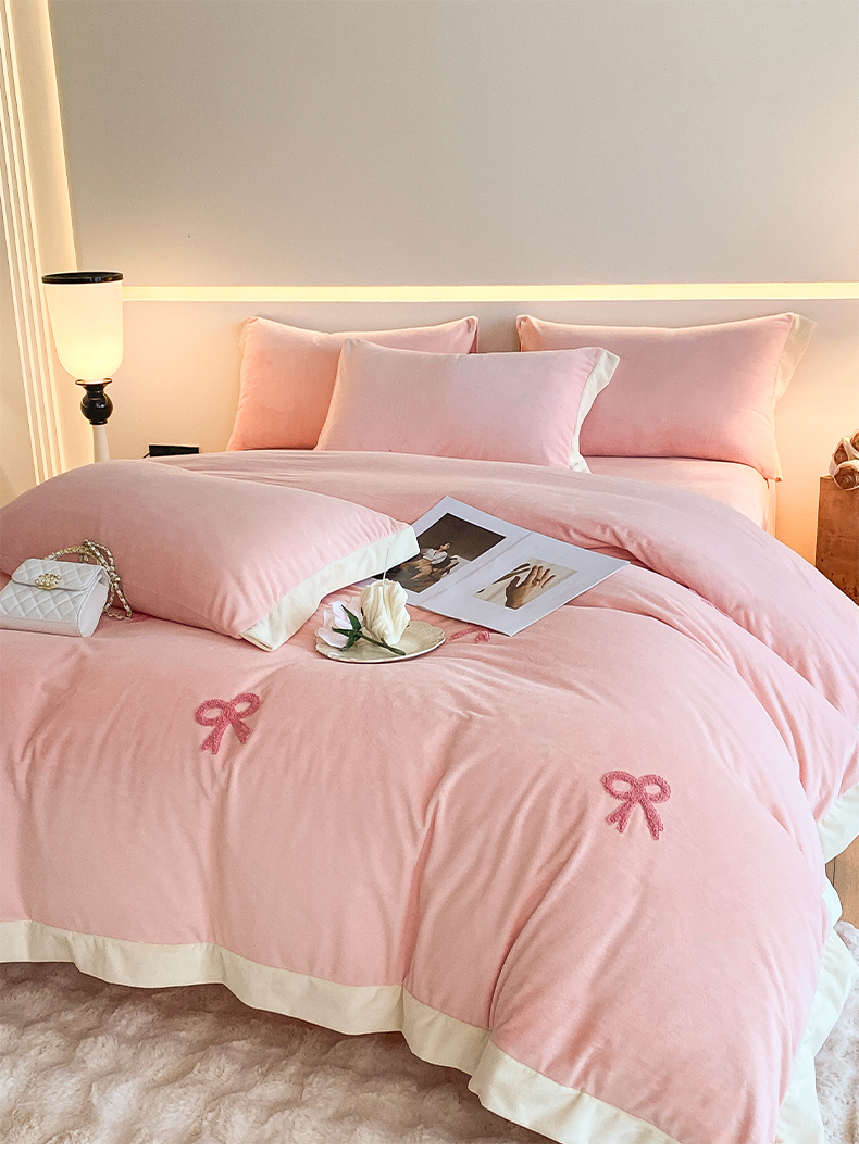 2024新款水晶绒拼角满版毛巾绣四件套 蝴蝶结-蜜桃粉