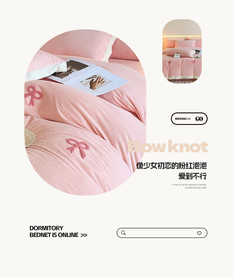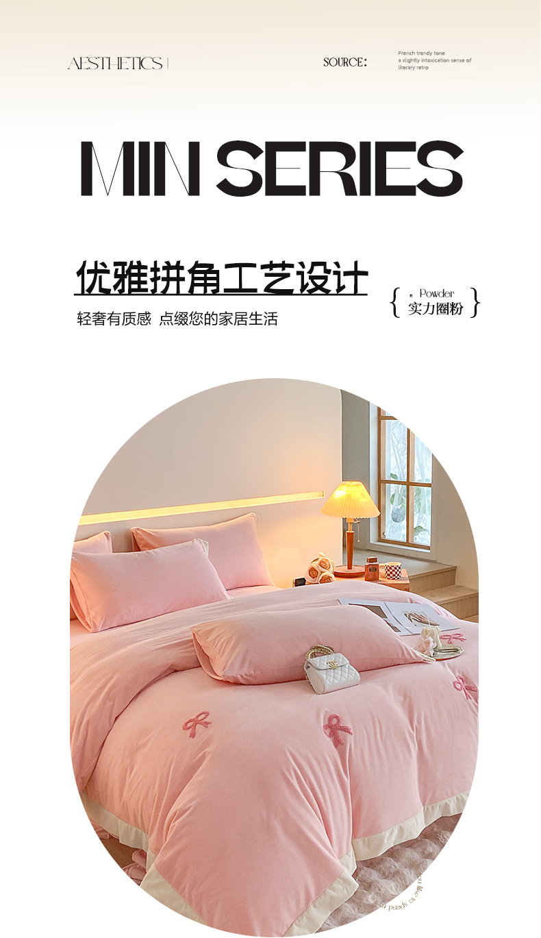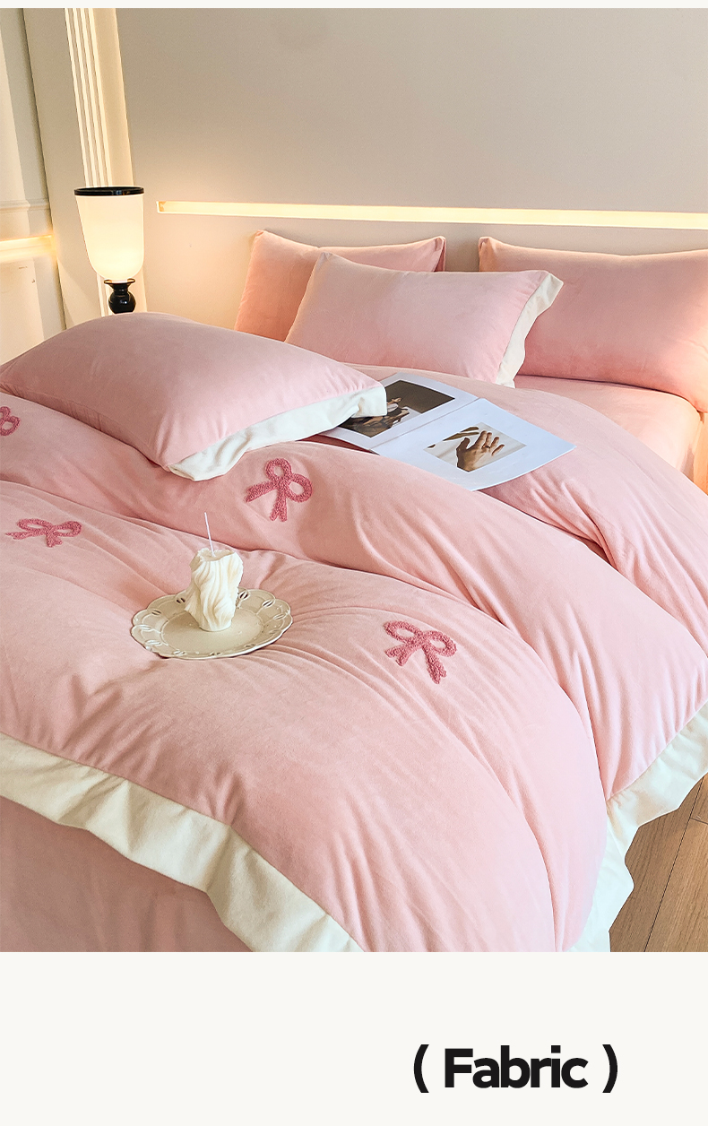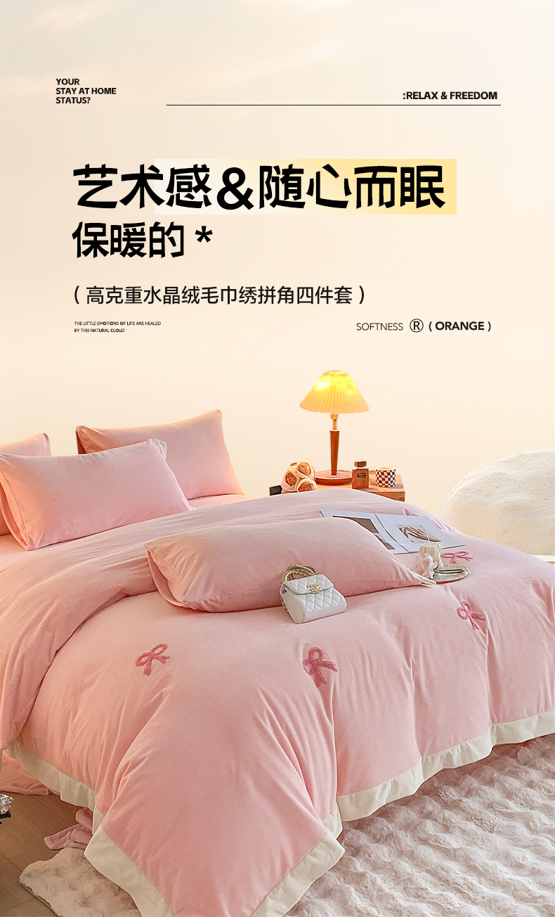 2024新款水晶绒拼角满版毛巾绣四件套 蝴蝶结-蜜桃粉